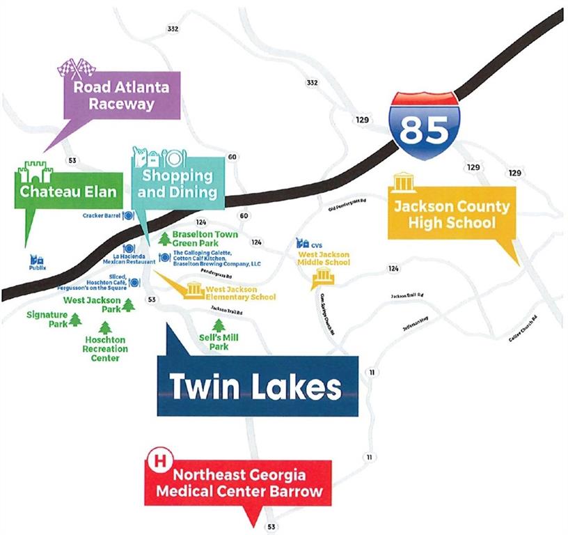Gorgeous & Private Homesite! Backs up to GREEN SPACE in Jackson County's newest Premier Master Planned Community with incredible amenities! RESORT style community! Twin Lakes is only 2 miles from I-85, 5 minutes to Downtown Hoschton/Braselton with their quaint shops, restaurants and local brewery. Newer sought after Jackson County Schools! SPECIAL FINANCING! Estimated completion March/April 2025. The GALEN floor plan is an affordable 4 bedroom, 2.5 bath Two-Story home with the Owner's Suite on the 2ND floor and a large rear COVERED patio in a master planned community of TWIN LAKES with AMAZING AMENITIES: POOL - CLUBHOUSE - FITNESS CENTER - PLAYGROUND - DOG PARK, LAKESIDE PAVILION and WALKING TRAILS to bike or stroll around the serene onsite LAKES. Home seekers will love this brand new home in a premier master planned resort community with gorgeous tree lined and cart pathways. Kitchen features WHTIE cabinets with Quartz countertops and stainless steel appliances. LVP 1st floor except bedrooms. Relax and enjoy your coffee in the morning, or a glass of wine with friends in the evening while grilling on your private patio. Total Price includes 2 zone lawn irrigation system, window blinds, 2 ceiling fans, garage door opener, architectural shingles, 4 sides brick water tables, etc. Smart Home connected. Jackson County's newest Premier Master Planned Community. Ask about the FREE 10 year warranty through RWC with this home! Twin Lakes is only 2 miles from I-85, 5 minutes to Downtown Hoschton/Braselton with their quaint shops, restaurants and local brewery. Northeast Georgia Medical Center is only 15 minutes away and Chateau Elan Winery and