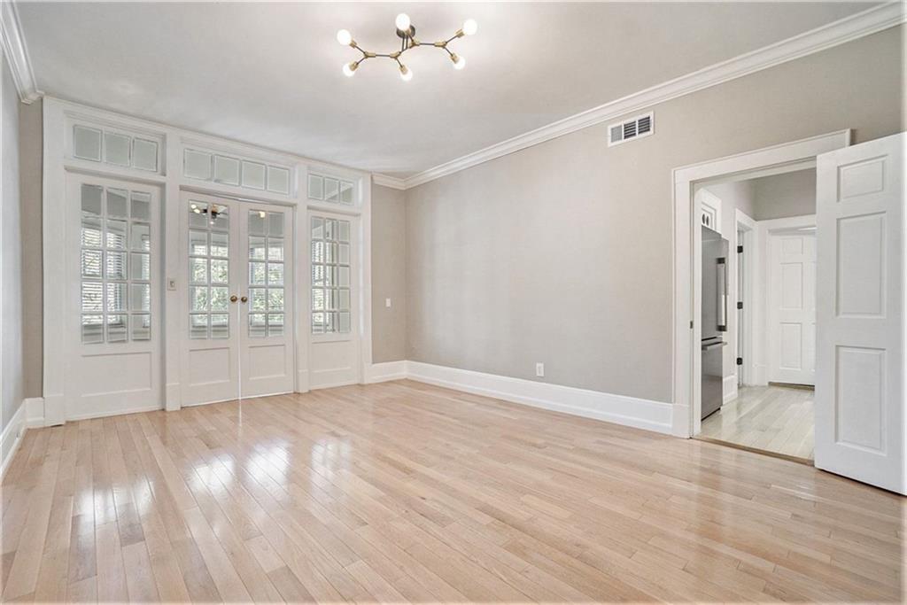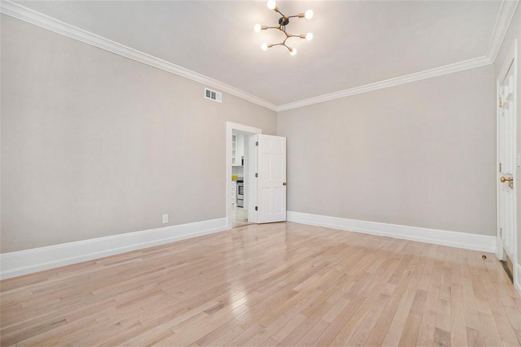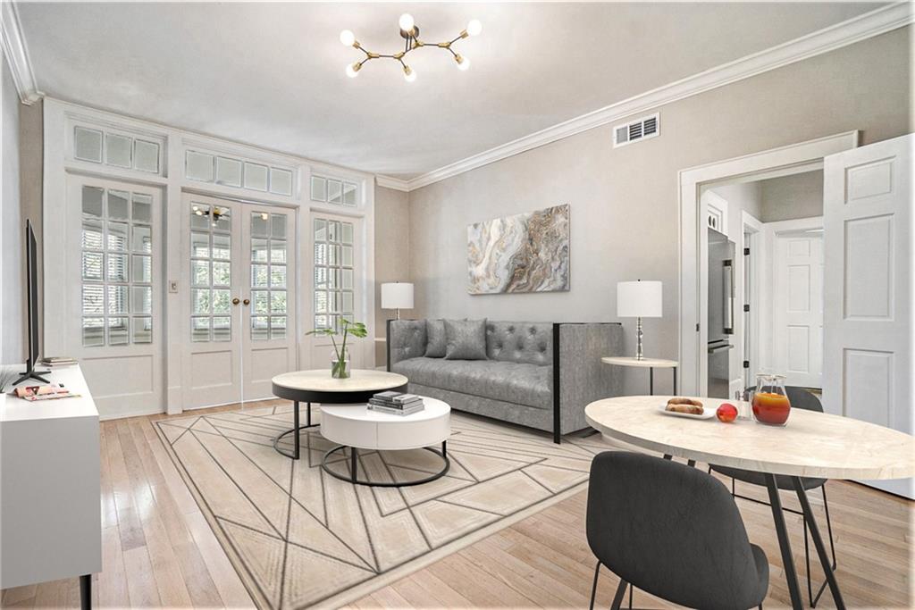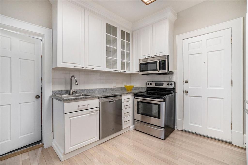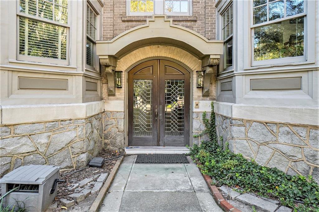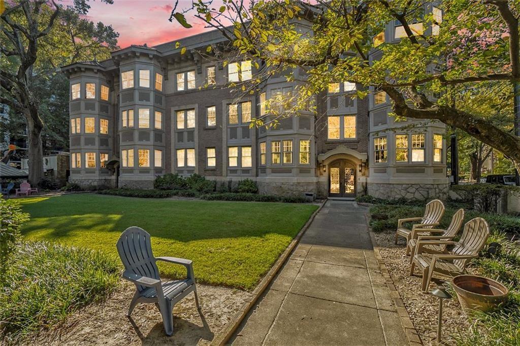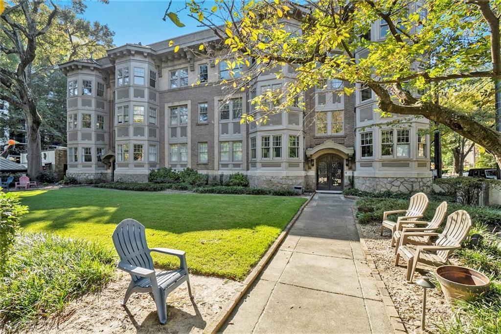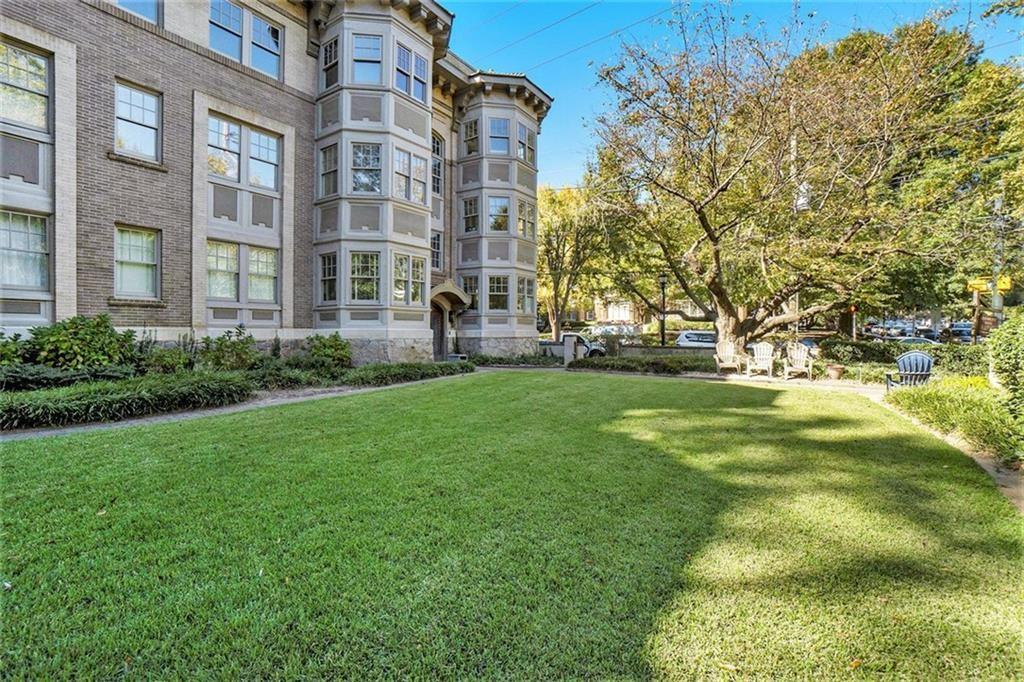 Circa 1910 Atlanta Landmark Condominium on Piedmont Park! This sophisticated, stunning, and remarkably renovated exquisite ONE bedroom + Sun Room with walls of windows w/sunrise east views of lavish front yard green space and Piedmont Park. This spacious Move In Ready home with NEW hardwoods, high ceilings accented by crown molding + modern finishes and lighting, includes bay windows w/custom faux wood blinds in Sunroom, adjacent to the oversized main living area separated by glass paneled French doors. Oversized Bedroom w hardwoods, custom closets shelving with NEW easy bypass doors with satin nickel hardware. Kitchen features tall wall white cabinetry accented by crown molding, granite counter top, stainless steel appliances, and NEW stainless steel refrigerator built-in to wall/closet plus pantry/laundry closet with the State of The Art full size LG combo washer/dryer unit. Bathroom is renovated with Slate Tiles, Hansgrohe shower control system and shower w custom glass door system all in satin nickel hardware; and custom bath vanity w/granite counter tops and slate tile floor. This exquisite home includes a storage unit in basement level of property, rear porch w/grill and ONE assigned parking space.