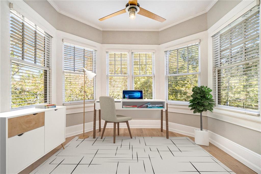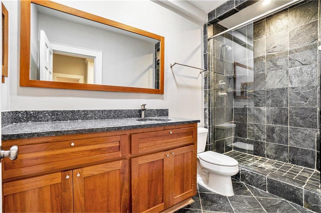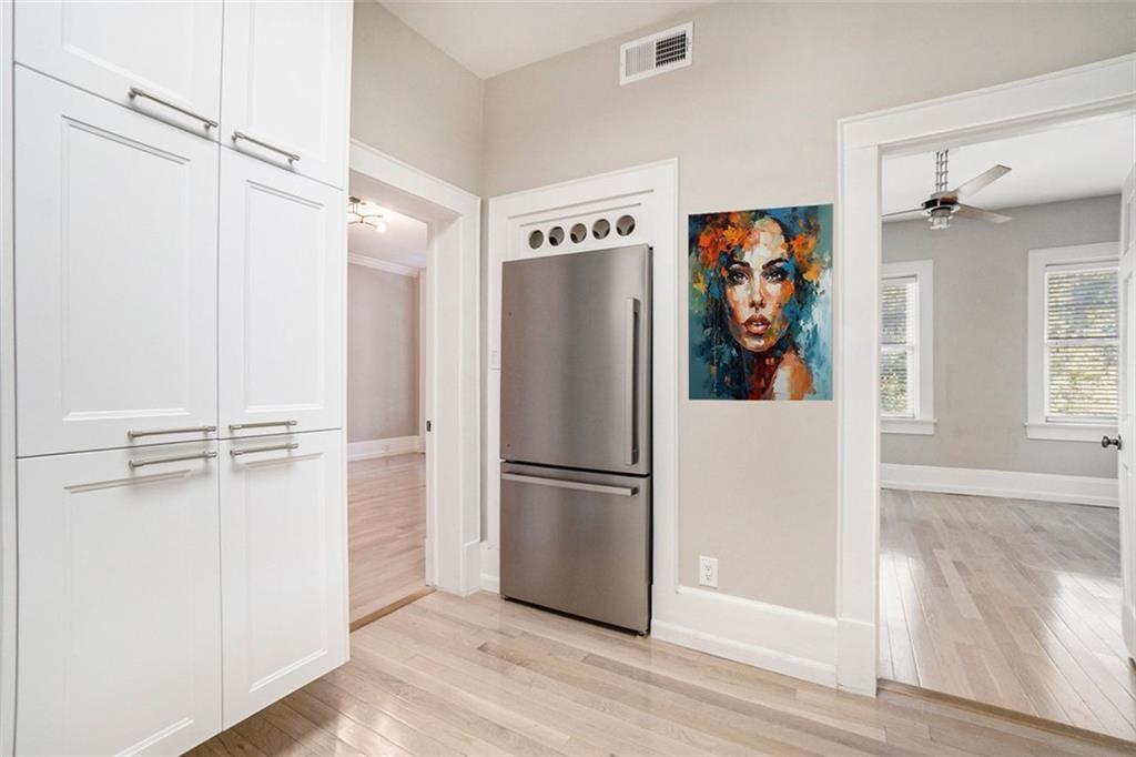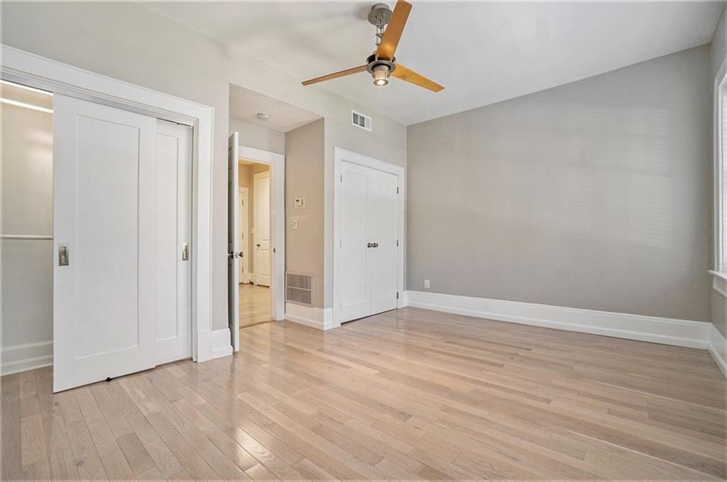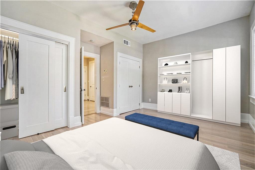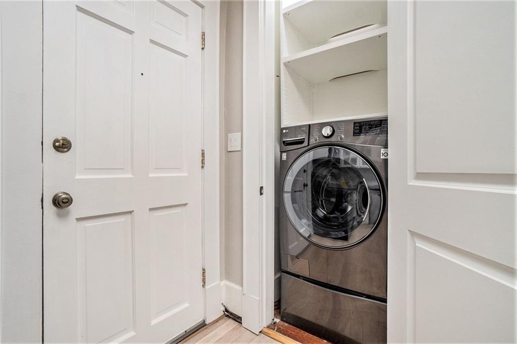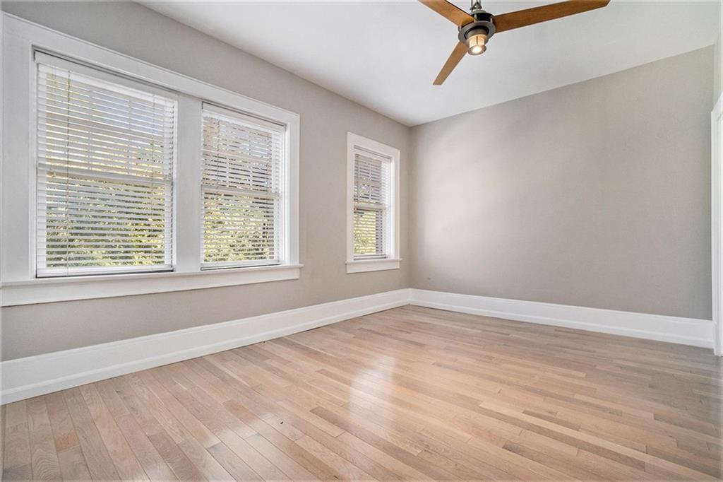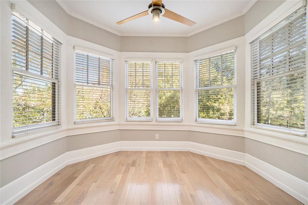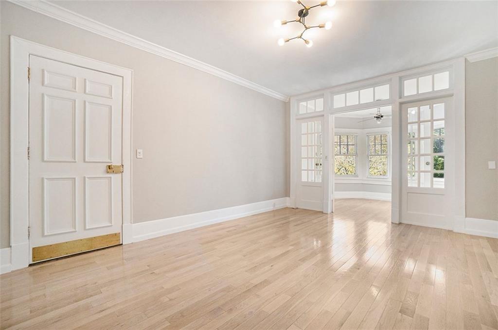 Circa 1910 Atlanta Landmark Condominium on Piedmont Park! This sophisticated, stunning, and remarkably renovated exquisite ONE bedroom + Sun Room with walls of windows w/sunrise east views of lavish front yard green space and Piedmont Park. This spacious Move In Ready home with NEW hardwoods, high ceilings accented by crown molding + modern finishes and lighting, includes bay windows w/custom faux wood blinds in Sunroom, adjacent to the oversized main living area separated by glass paneled French doors. Oversized Bedroom w hardwoods, custom closets shelving with NEW easy bypass doors with satin nickel hardware. Kitchen features tall wall white cabinetry accented by crown molding, granite counter top, stainless steel appliances, and NEW stainless steel refrigerator built-in to wall/closet plus pantry/laundry closet with the State of The Art full size LG combo washer/dryer unit. Bathroom is renovated with Slate Tiles, Hansgrohe shower control system and shower w custom glass door system all in satin nickel hardware; and custom bath vanity w/granite counter tops and slate tile floor. This exquisite home includes a storage unit in basement level of property, rear porch w/grill and ONE assigned parking space.