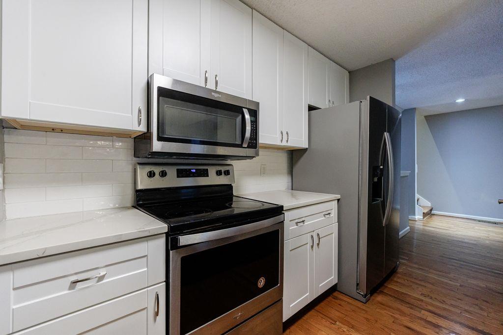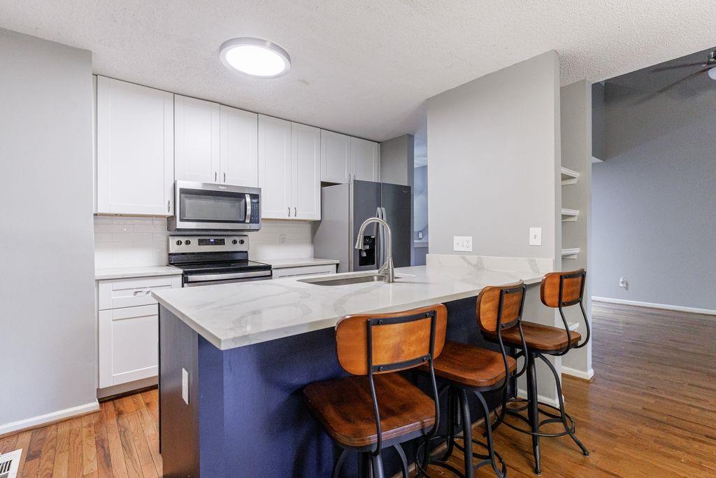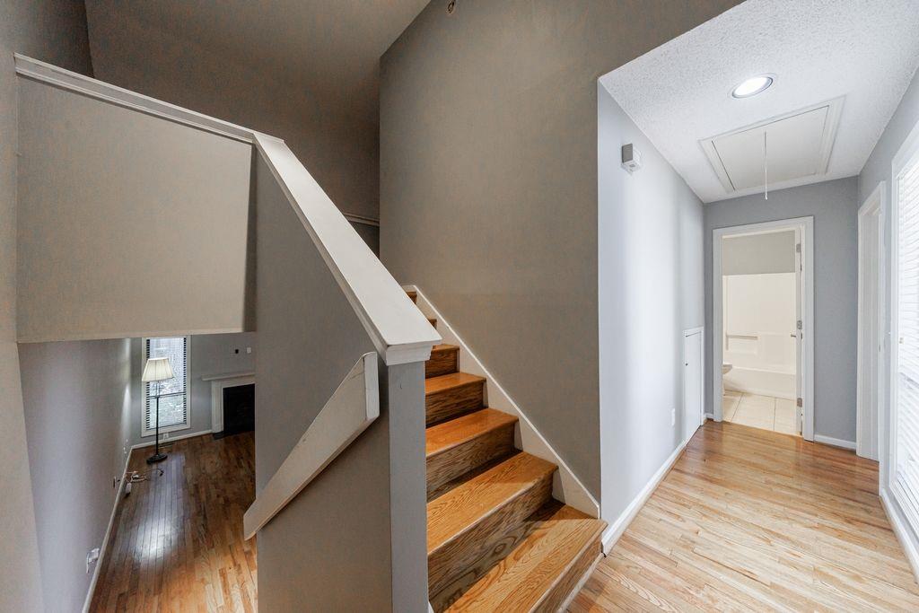 Location, Location, Location! Don't Miss this Opportunity to Live in the HEART OF SMYRNA. You'll Love the OPEN CONCEPT with a Vaulted Ceiling in the Family Room with a Fireplace and Gas Logs. RENOVATED KITCHEN with New Cabinets, QUARTZ COUNTERTOPS, Pantry, STAINLESS STEEL APPLIANCES, Tile Backsplash and Breakfast Bar. The Dining/Breakfast Room has French Doors that Lead to the PRIVATE FENCED BACKYARD with Lots of Deck Space for Entertaining. Up just a few steps is One Bedroom, an Updated Full Bathroom and Laundry Closet. Then up a Few More Steps is an En Suite Bedroom with a Walk-in Closet and Updated Full Bathroom. More Great Features Include the 1 Car Garage, Hardwood Floors, Tile Foyer and Storage Areas. Smyrna Market Village is only 1 mile away! Truist Park and The Battery are only 3 miles away as well as The Silver Comet Trail! Easy Commute - Minutes from I-285.