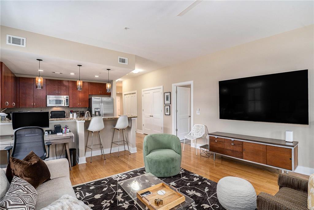 Experience elevated living in this stunning top-floor corner condominium, perfectly positioned in one of Buckhead's most sought-after locations. This sun-drenched 2-bedroom, 2-bath home combines elegance and modern upgrades within a fully renovated luxury building. Inside, you'll find a stylish kitchen featuring a pantry, breakfast bar, and stainless steel appliances, including a gas range—ideal for both daily living and entertaining. The spacious living room opens onto a private balcony, offering picturesque treetop and city views. The owner's suite boasts direct balcony access, a large walk-in closet with custom shelving, and a luxurious bathroom with a double vanity, custom tile shower, and spa tub. The guest bedroom provides ample closet space, while a versatile flex space serves as an office or dining area. Beautiful bamboo flooring enhances the main living spaces, complemented by plantation shutters and custom shelving throughout. This residence includes two covered parking spots in a secure underground garage. The building itself has seen numerous upgrades, including a main floor renovation with a club room and fitness suite, a new entrance with a custom iron door, and new flooring and paint in hallways. Additional updates include upgraded lighting, ceiling fans, and a brand-new refrigerator and hot water heater. Enhanced security features include a fully upgraded system with keyless entry, call box, camera access, and touchless motion sensors for secure and convenient access. Ample visitor parking makes hosting easy. Situated near the vibrant shops and restaurants of Phipps Plaza, Dresden Drive, and Lennox Marketplace, this location offers the perfect blend of comfort and convenience. Access to GA 400 and I-85 is just minutes away, making this luxury residence an ideal choice for effortless living.