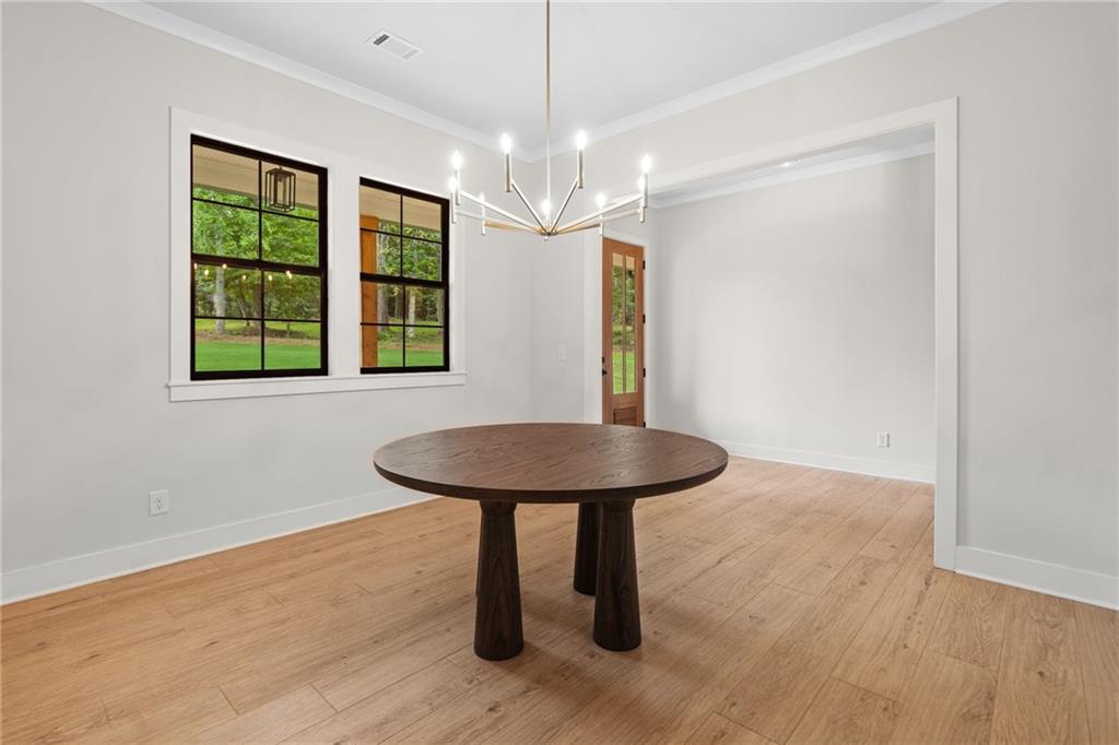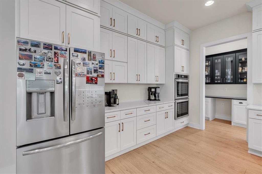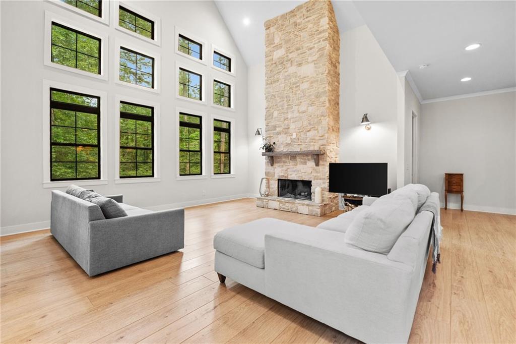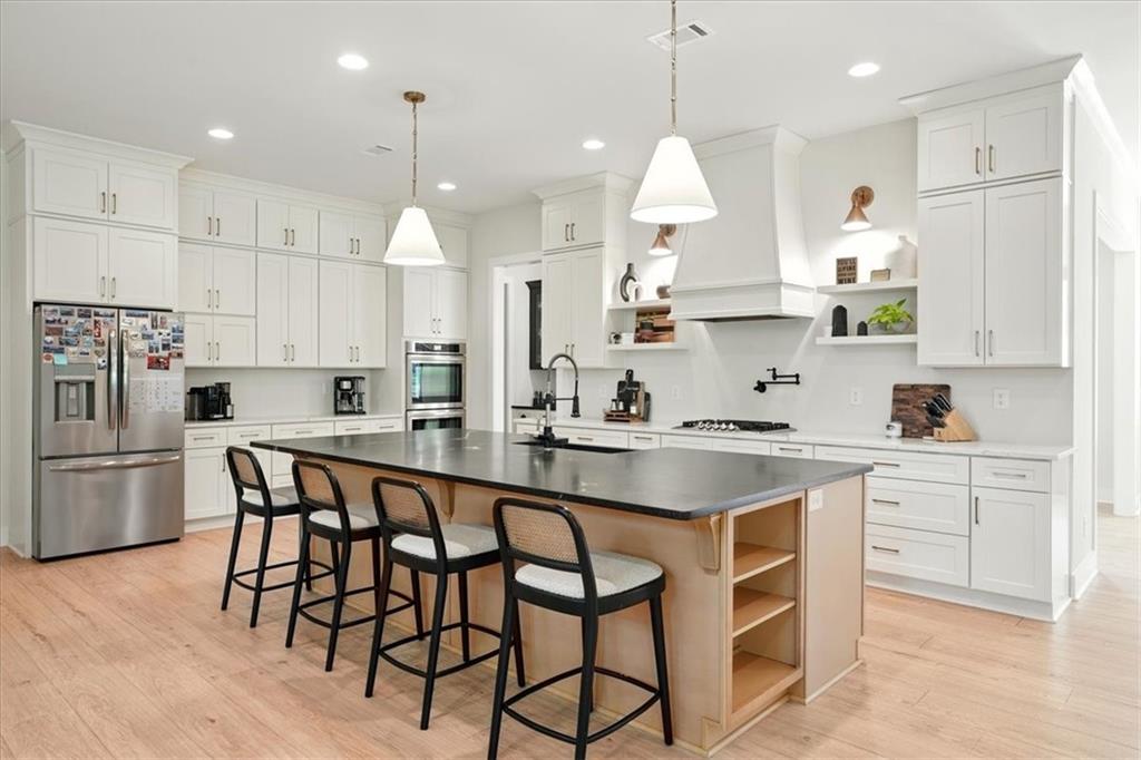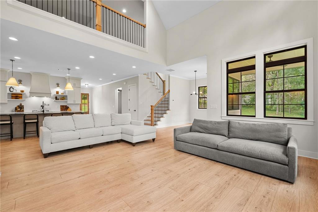 Welcome to this exceptional 4 bedroom, 4 bathroom modern farmhouse nestled on a beautiful wooded 1.36 acre lot with NO HOA. Designed with both elegance and comfort, this home boasts soaring 10-foot ceilings on the main and breathtaking two-story windows that flood the space with natural light. Step inside the double front door to find LVP flooring, a dramatic floor-to-ceiling stone fireplace in the living room and a chef's dream kitchen! The kitchen features inset soft-close cabinetry, quartz countertops, a black granite island with an apron-front farmhouse sink, double ovens, a pot filler and stainless steel appliances. Just off the kitchen is a fabulous and spacious butler's pantry with space for a wine-fridge. A charming breakfast area overlooks the covered patio, perfect for enjoying morning coffee or hosting guests. You'll also find a separate formal dining room and a convenient butler's pantry for easy entertaining. The main-level primary suite is a true retreat with a spa-like bathroom offering a marble double vanity, a luxurious soaking tub, and a separate tiled shower. An additional bedroom on the main level makes an ideal office or flexible guest space. Upstairs, a beautiful staircase leads to a versatile large, open loft area, along with two generously sized bedrooms and 2 full bathrooms - one bedroom has an en-suite bath. This energy-efficient home is equipped with spray foam insulation, a tankless water heater and a spacious 3-car garage. With timeless charm and modern features, this home has everything you could ask for.