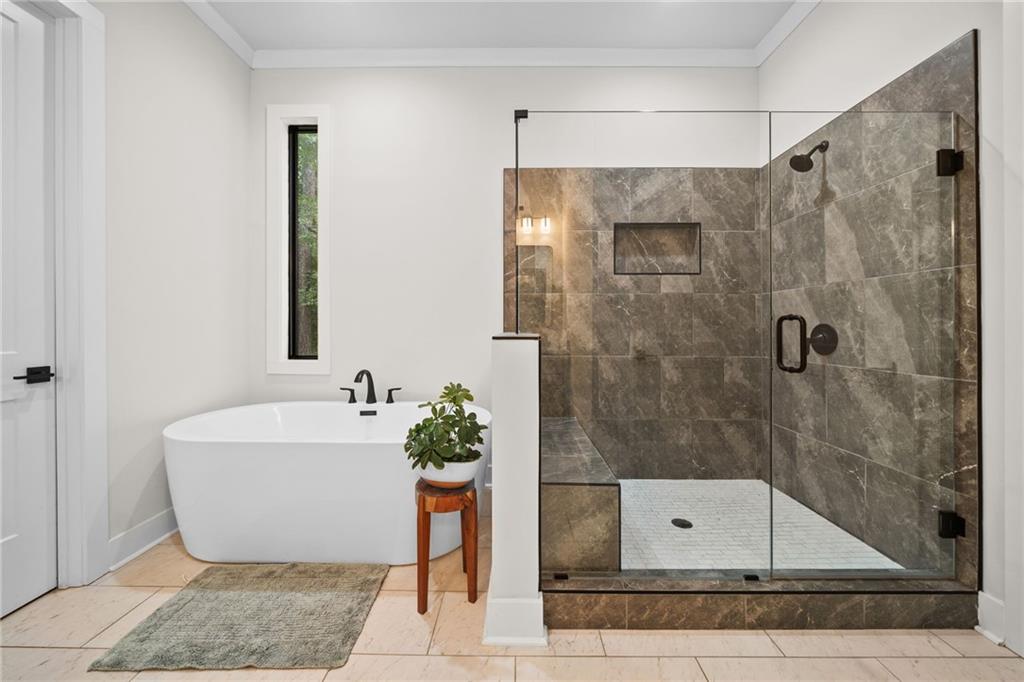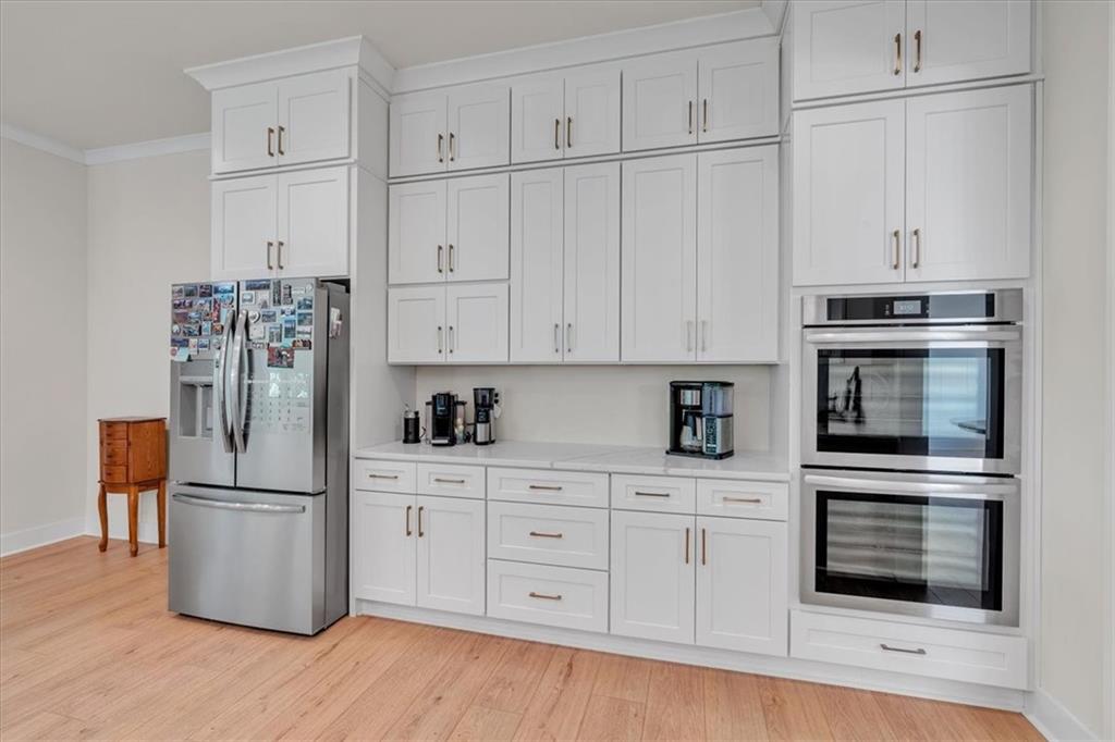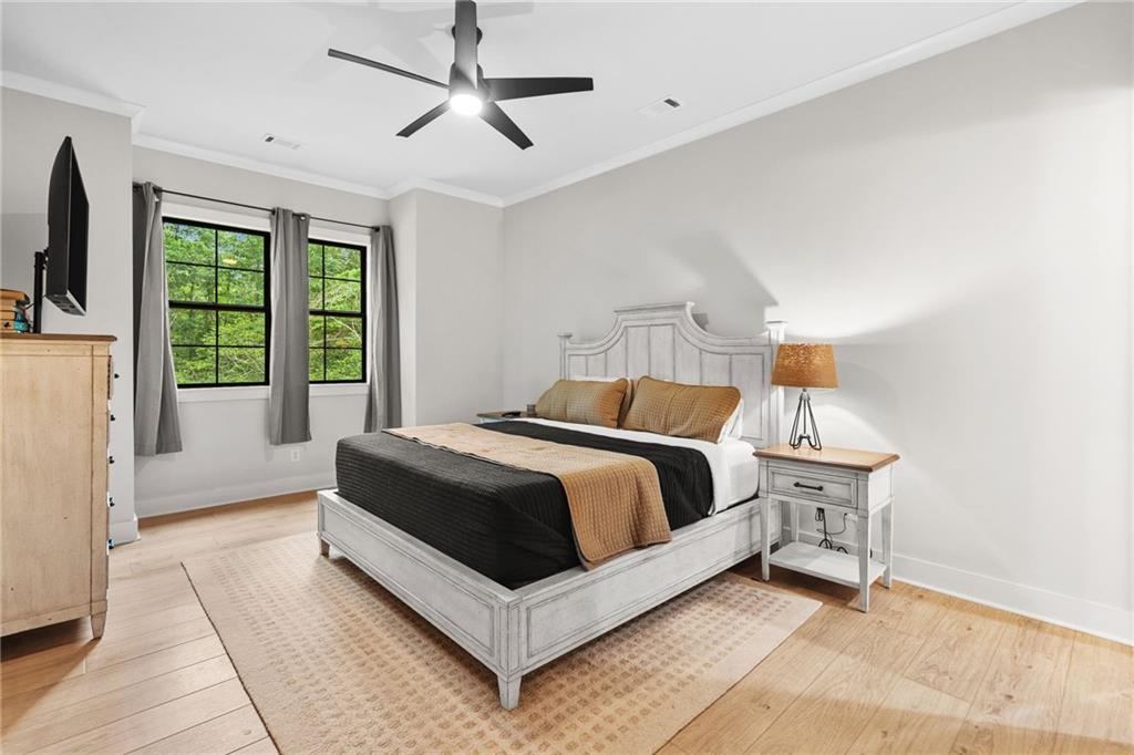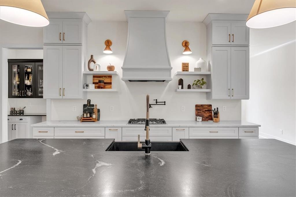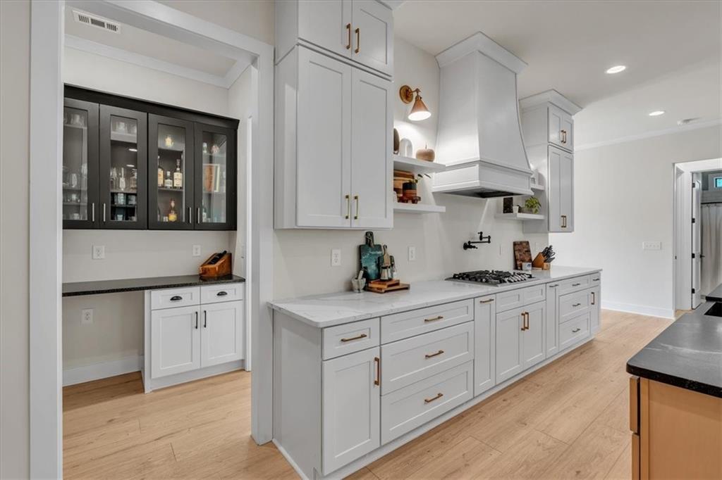 Welcome to this exceptional 4 bedroom, 4 bathroom modern farmhouse nestled on a beautiful wooded 1.36 acre lot with NO HOA. Designed with both elegance and comfort, this home boasts soaring 10-foot ceilings on the main and breathtaking two-story windows that flood the space with natural light. Step inside the double front door to find LVP flooring, a dramatic floor-to-ceiling stone fireplace in the living room and a chef's dream kitchen! The kitchen features inset soft-close cabinetry, quartz countertops, a black granite island with an apron-front farmhouse sink, double ovens, a pot filler and stainless steel appliances. Just off the kitchen is a fabulous and spacious butler's pantry with space for a wine-fridge. A charming breakfast area overlooks the covered patio, perfect for enjoying morning coffee or hosting guests. You'll also find a separate formal dining room and a convenient butler's pantry for easy entertaining. The main-level primary suite is a true retreat with a spa-like bathroom offering a marble double vanity, a luxurious soaking tub, and a separate tiled shower. An additional bedroom on the main level makes an ideal office or flexible guest space. Upstairs, a beautiful staircase leads to a versatile large, open loft area, along with two generously sized bedrooms and 2 full bathrooms - one bedroom has an en-suite bath. This energy-efficient home is equipped with spray foam insulation, a tankless water heater and a spacious 3-car garage. With timeless charm and modern features, this home has everything you could ask for.