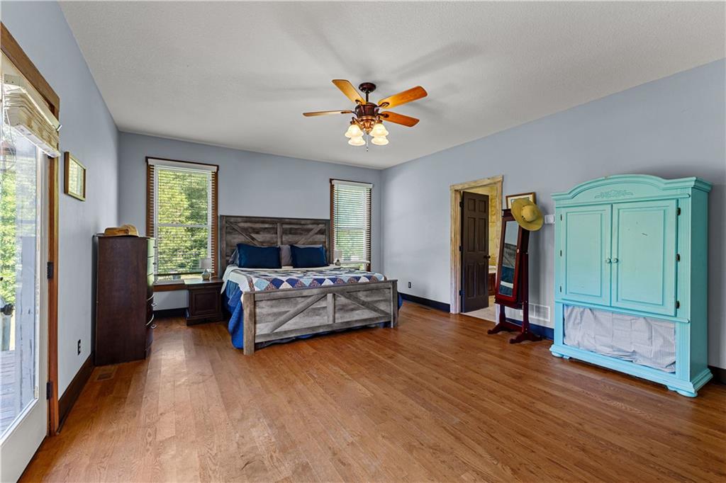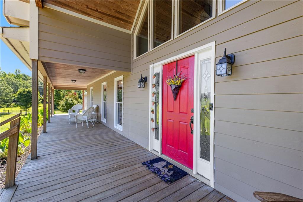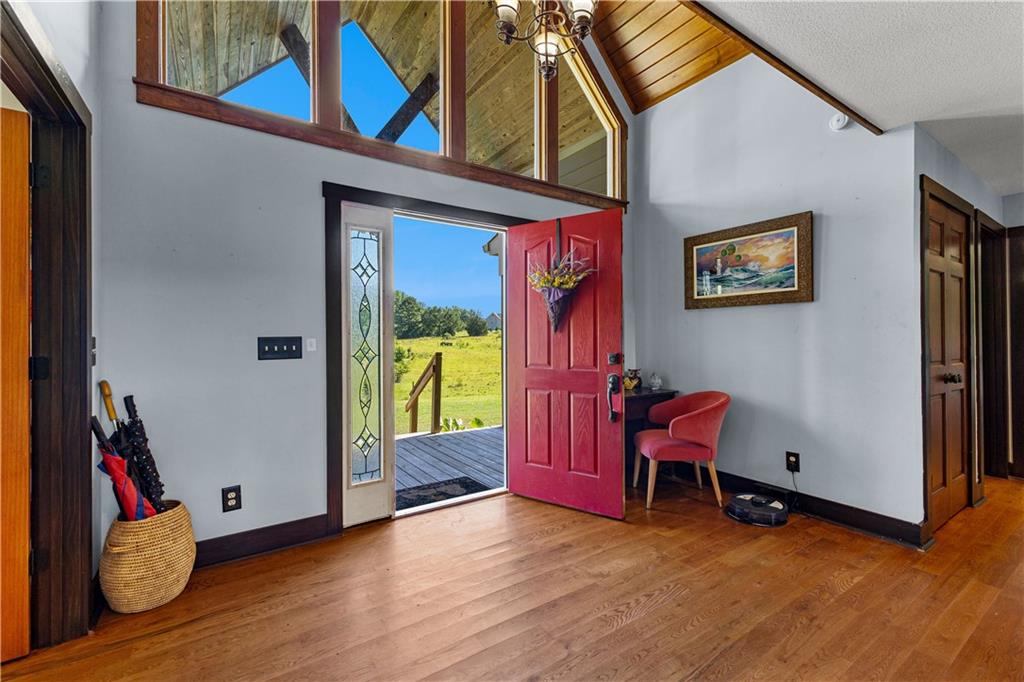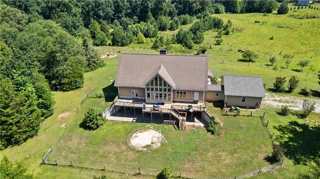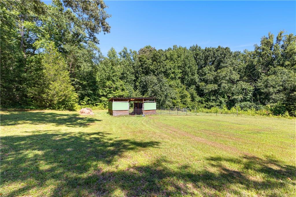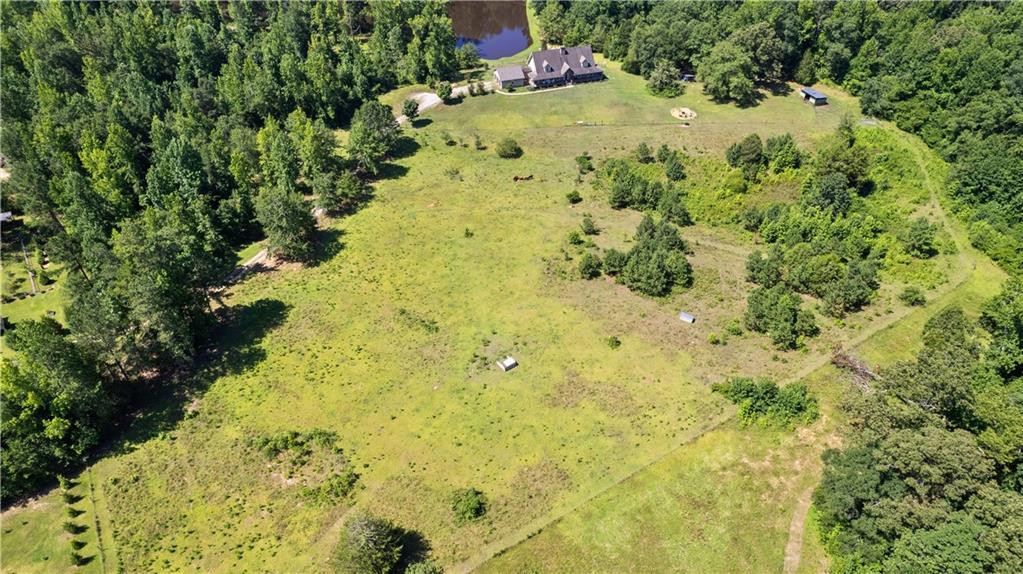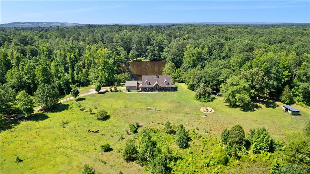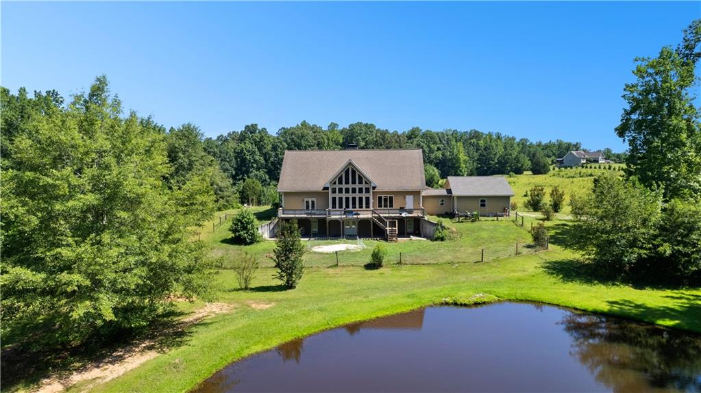 **ASK ABOUT ACCESS TO A LOWER-THAN-AVERAGE INTEREST RATE!!!** Welcome home to your very own piece of countryside in the south! Whether you're interested in the quiet of the country, where every star is visible at night, waking up to a lake view and/or a rooster crowing, cultivating your own mini farm, growing your own peaches, pears, and blueberries, or just having the option to do any of those things, THIS. IS. IT!! And that's just the outside...Inside, you'll find 20-foot tall floor-to-ceiling windows with an open view to the lake, master bedroom on main, and a beautifully handcrafted fireplace & chimney which stretches throughout all three stories, from the basement floor to the 2nd floor ceiling. Don't miss the authentic arrowheads perfectly grouted into the structure on every level, nor the option for a potbelly stove or something like it in the basemen!. Spanning the entire width of the house are both a wrap-around porch with plenty of space for allllll the rocking chairs, as well as a deck with a view on the back side of the home. With multiple chicken coops (which can stay or go), 6+ acres of fenced pasture, a 28-tree peach & pear orchard, nearly 2 acres of wild blackberries, pole barn, and a couple other useful structures, this property is literally bursting with potential in so many directions! Oh! Speaking of so many directions...there's a natural underground spring running through the property, and guess what that means? It's totally possible to dig your very own lake or to have a beautiful stream running across the property! Schedule a private tour today; this home is truly a gem!
