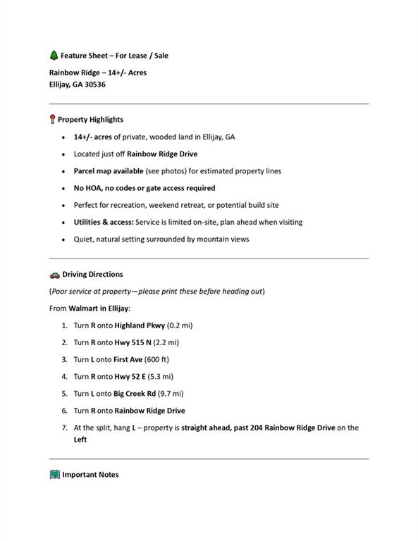 Please be sure to print the parcel map or screenshot it to bring with you when going to the property! Parcel map shows where the 14 acres is that is being sold. Not great service at the this property. No gate code or any codes to access. See parcel map in photos for estimated property lines of the 14+/- acres. Property is on the L of 204 Rainbow Ridge Drive, Ellijay, GA 30536. Use landglide. From Walmart in Ellijay, Turn R onto Highland Pkwy. In 0.2 mi, turn R onto Hwy 515 N. In 2.2 mi, turn L onto First Ave. In 600 ft, turn R onto Hwy 52 E. IN 5.3 mi, turn L onto Big Creek Rd. In 9.7 mi, turn R onto Rainbow Ridge Drive. Hang L at the split and property is straight ahead right past 204 Rainbow Ridge Drive, Ellijay GA 30536 on the Left.