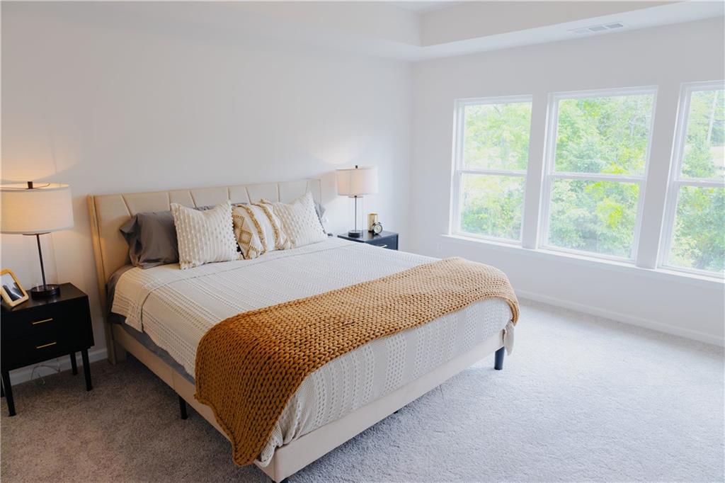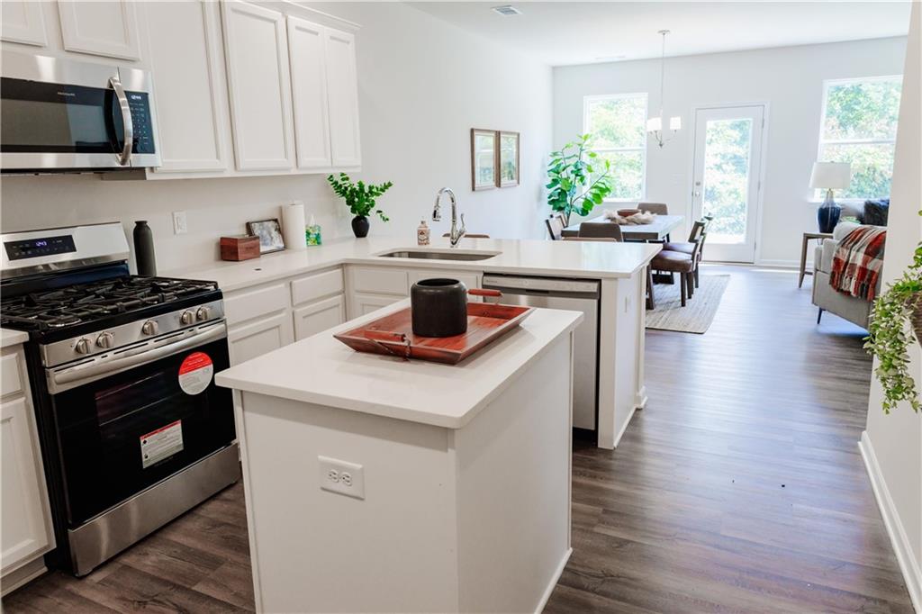 Beautifully crafted Model Home for sale at Castleberry Pointe. The Cambridge plan is a 3 Bedroom 2.5 Bath with a Loft/Flex Room. This inviting home features an Open Concept with an inviting Foyer, 1/2 Bath on main level. Family Room with Gas F/P open to D/R which is overlooked by the Kitchen with White Cabinets, Island, Breakfast Bar, Quartz, LED Lighting, SS Appliances, including Side by Side Ref., Microwave, Gas Stove, Dishwasher, & Vinyl Plank floor throughout the main level. Open Rail Stairs leading to 2nd level with Laundry Rm, 2 Secondary Bedrooms, and shared Hall Bath with raised height cultured marble sink & Bath/Shower Combo. The versitle Loft/Flex space leading to the Primary Suite featuring Trey ceiling ambundance of natural light. Master Bath has hugh Walk-In Closet, 42" Tiled shower, Garden Tub, Raised Height double bowl Cultured Marble sinks. The exterior has a Rear Patio for outdoor living and a 2 Car Front Entry Garage. The location of this community is one of it' best features. Close to SR 400, the Outlet Mall and Restaurants. All appliances stay the furniture will be removed. This home will be ready to close December of 2025.