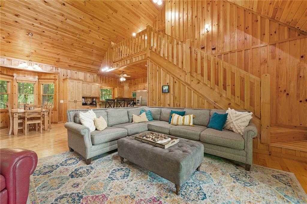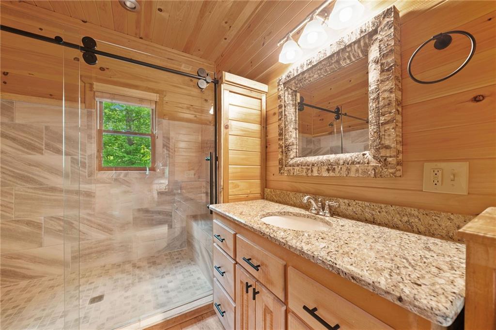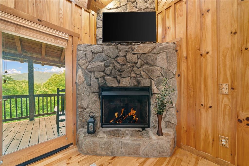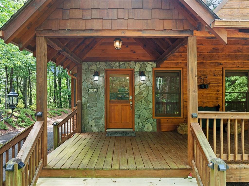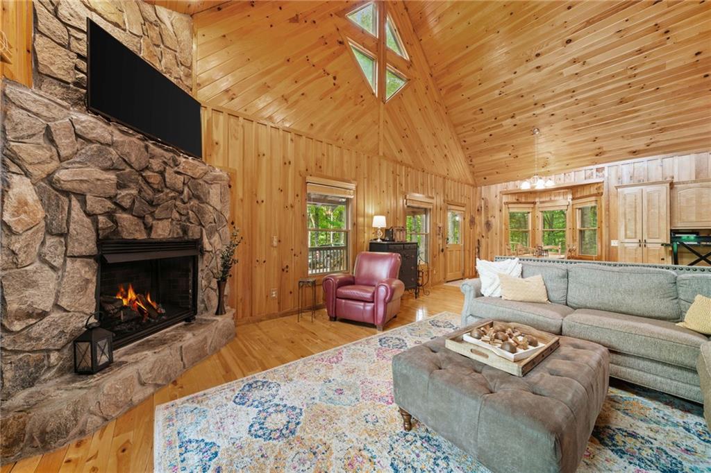 This exemplary mountain lodge with stunning Cohutta Mountain views can now be yours! Perched in a small gated community with nearly all paved access, this exquisite lodge offers the perfect blend of luxury, comfort, and convenience. Whether you're seeking a full-time residence, vacation getaway, or investment opportunity, this home checks all the boxes. Designed for seamless indoor and outdoor living, the spacious wraparound porch on the main level invites you to take in the breathtaking views of the Cohutta Mountains beside a cozy outdoor stone fireplace. Inside, the open-concept great room features soaring ceilings, a beautiful stone fireplace, and direct access to the rear porch, perfect for relaxing or entertaining with a mountain backdrop. The kitchen will please any culinary enthusiast with a two-tiered island with bar seating, granite countertops, pantry storage, and an adjacent dining area for gathering with family and friends. The main-level primary suite offers French door access to the porch, a gorgeous spa-like ensuite bath with a whirlpool tub, separate tiled shower, and convenient hallway access. A laundry closet rounds out the main level. Upstairs, you'll find a cozy loft space leading to a second master suite with vaulted ceilings, walk-in closet, a private covered balcony with stunning views, and a tiled ensuite bath with large shower. The fully finished terrace level is ready for fun, featuring a secondary living area, game space with bunks, plus a spacious bedroom with queen bed and additional bunk beds, a full bath, and walk-out access to the lower deck with a large hot tub, where mountain views continue to impress. Set on a generous lot that offers peace, privacy, and natural beauty. Just around the corner from trout fishing in the Toccoa River or 15-20 minutes from downtown Blue Ridge shopping & dining. This exceptional mountain lodge is your chance to live the North Georgia lifestyle in comfort and style.