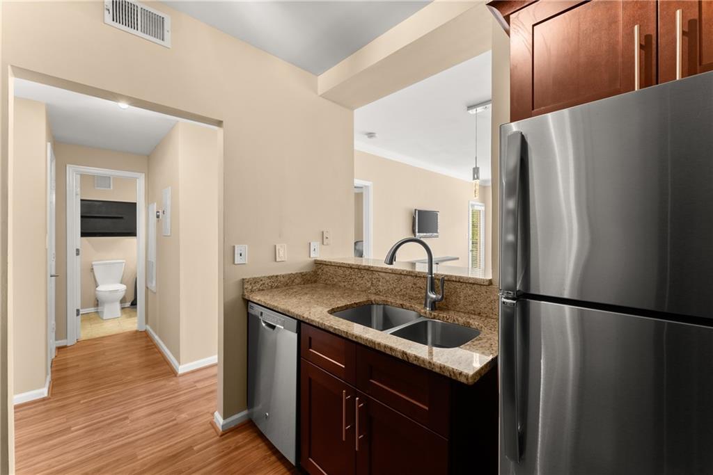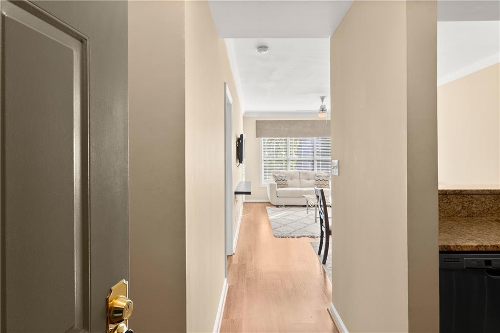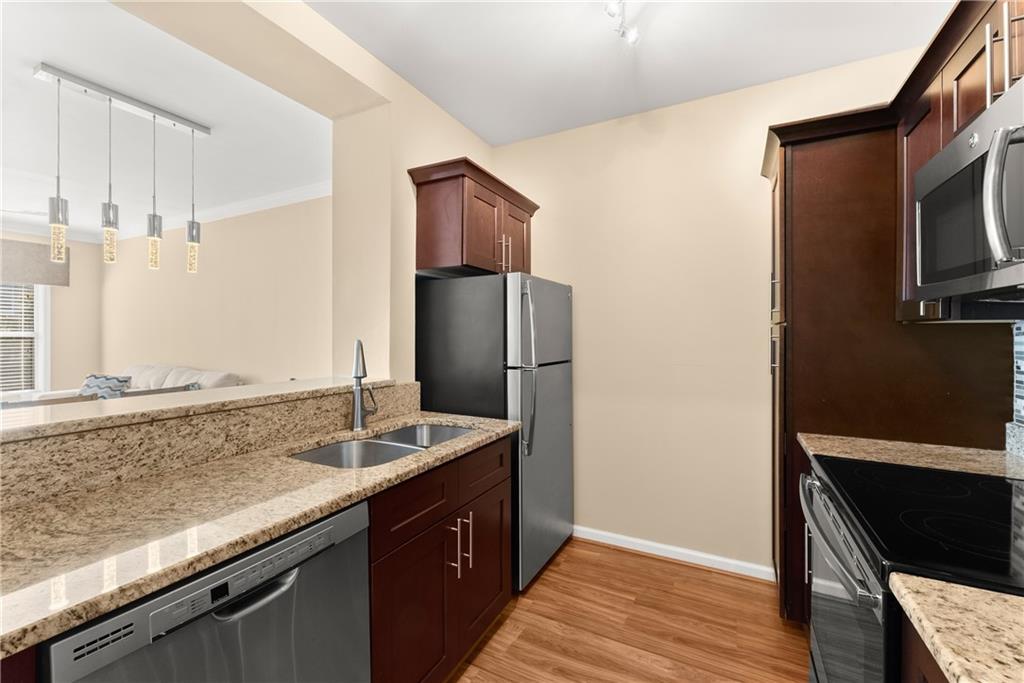 Welcome to 1406 River Green Drive – a beautifully maintained 1-bedroom, 1 bath condo in a prime Atlanta location near Vinings and Buckhead! This thoughtfully designed home offers a spacious open-concept layout featuring a bright family room and dining area that flows seamlessly into the updated kitchen, complete with granite countertops, stainless steel appliances, and a convenient view into the living space — perfect for entertaining. Enter the home to find hardwood flooring, neutral paint colors, and loads of natural light. The master bedroom is a great size and features a walk in closet and en suite bath with an oversized tile shower and modern black vanity and mirror. Step out onto your private balcony to enjoy your morning coffee or unwind at the end of the day. This condo is conveniently located near local shoppes, dining, and roadways to make your commute a breeze. Additional features include: gated entry, bright lobby area, elevator access, great windows, and the laundry room on the same floor within close proximity of the unit. You will enjoy the community amenities such as a secure, gated entry, pool, fitness center, clubhouse, courtyard, grills, dog park, and so much more!