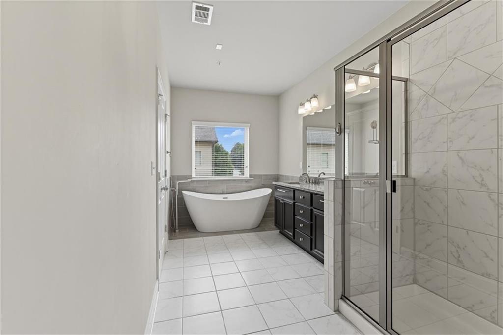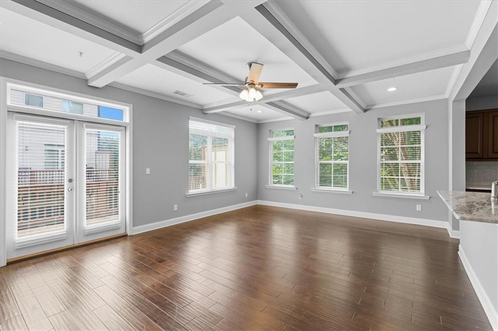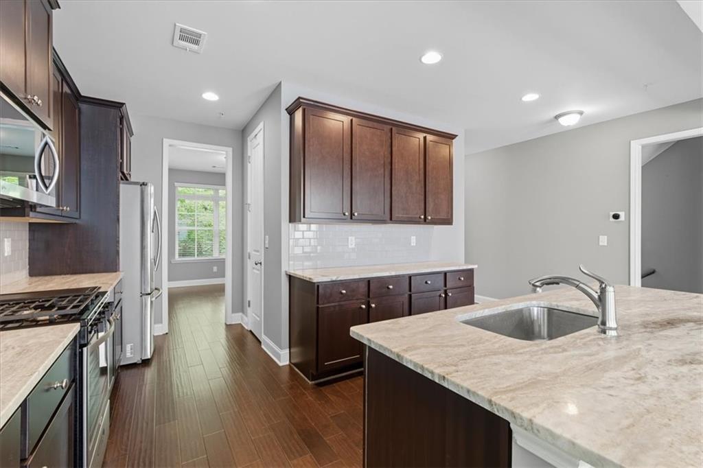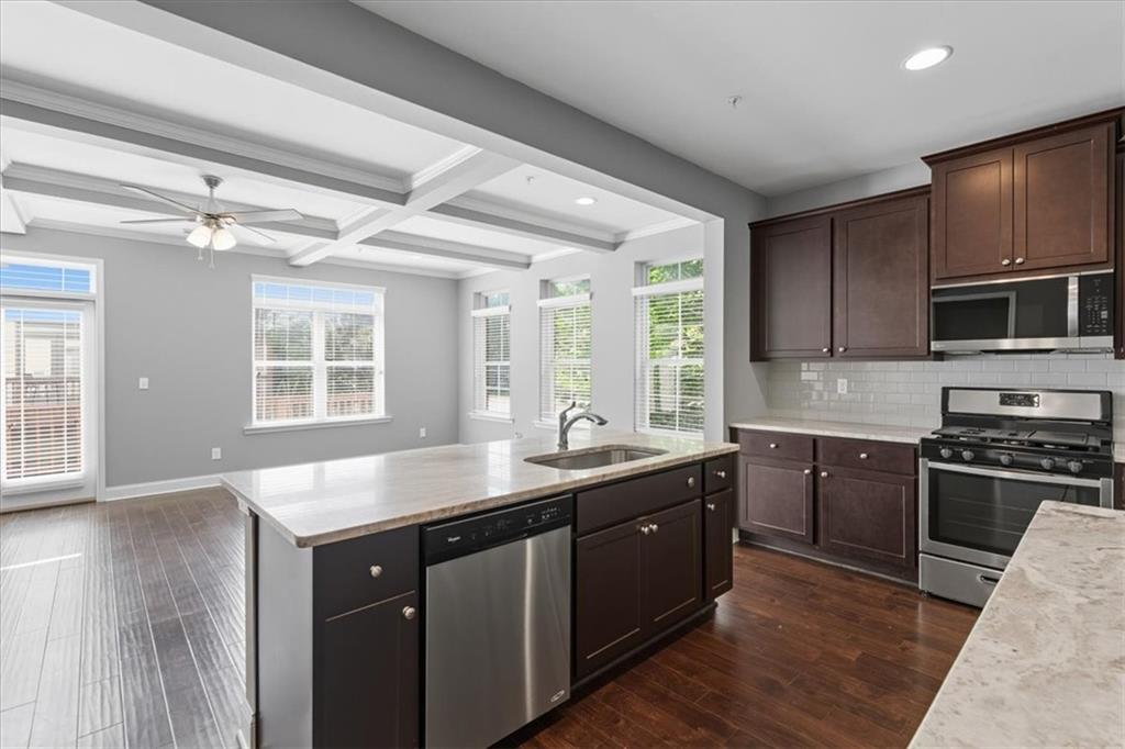 Move-in-ready! Laurel Gate Townhomes, end unit, gated community, 4 bedrooms, 3 full baths, half bath, 2 car garage, front porch, and back deck. Full bedroom and bath on the lower level. Located right off I-285, with private wooded areas. HOA is responsible for exterior of home. Upgrades: two-sided brick, hardwoods, coffered and tray ceilings, tankless water heater, custom built-in cabinets, stand-alone tub, walk-in shower, tile flooring, SS appliances, extended kitchen island, custom trim, nest thermostats and more! Convenient location minutes to I-285/I-75, Smyrna Market Village, Vinings Jubilee, Restaurants, Shopping, Silver Comet Trail, and The Battery/Truist Park. Walkable to Tolleson Park with Swimming Pool, Tennis Courts, Playground, Ball field, and Walking Trails. Award Winning King Springs Elementary School in the Cambell HS district. Two community gates: one is entry only, and the other is exit only. Rate buydown information is available, request from agent.
