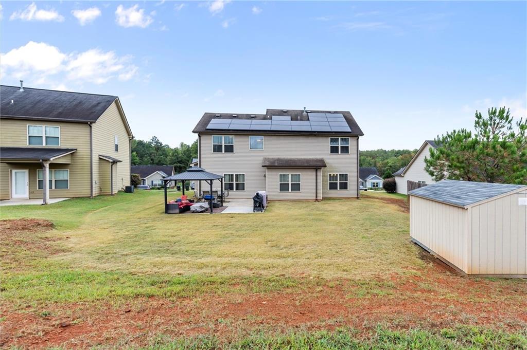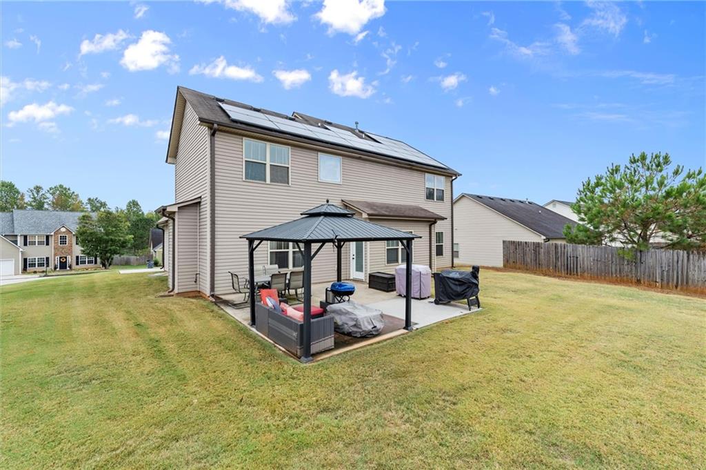 Welcome to this charming 4-bedroom, 2.5-bath home boasting 2,294 square feet of beautifully designed living space in Villa Rica, GA! This smart home is thoughtfully equipped with modern technology, including a security system with cameras, smart thermostats, a smart dishwasher, and solar panels to help reduce utility costs. The open-concept floorplan creates a wonderful flow, with the formal living and dining rooms seamlessly connected—perfect for entertaining. The kitchen features newer stainless-steel appliances, granite countertops, a breakfast bar, and an eat-in area with a view to the cozy family room, complete with a stone fireplace. Upstairs, you’ll find four spacious bedrooms, including an oversized primary suite with a sitting area—an ideal retreat after a long day. The primary bath offers double vanities, a separate tub, and a shower for added comfort. The laundry room is conveniently located upstairs for easy access. Step outside to enjoy a level backyard featuring a pergola—perfect for relaxing or entertaining—and an outbuilding for extra storage. Located in a swim community, the pool is just steps away from your front door! You’ll love the convenience of being close to shopping, dining, and easy access to I-20. Plus, this home is USDA qualified, meaning no down payment is needed if you qualify—making it an incredible opportunity to own your dream home!