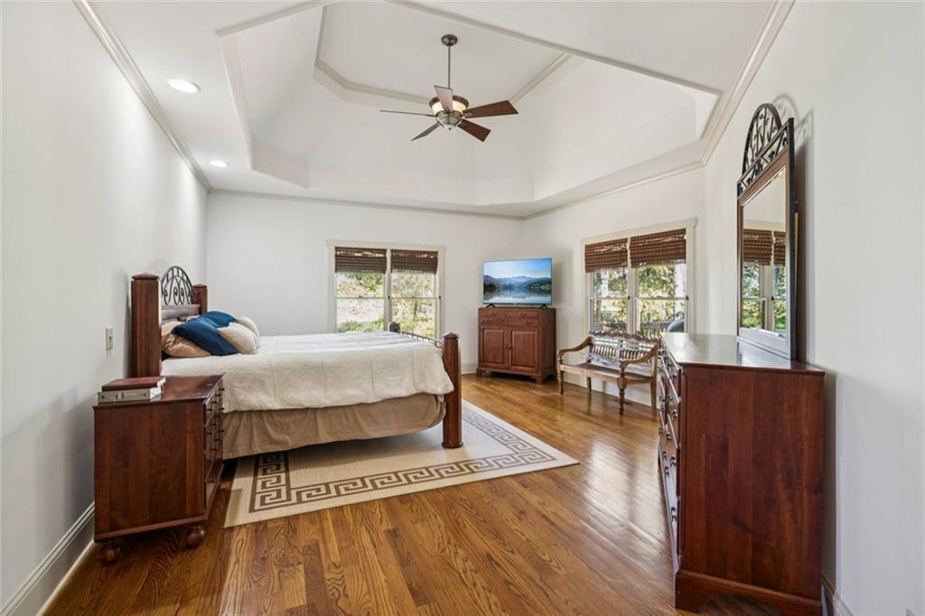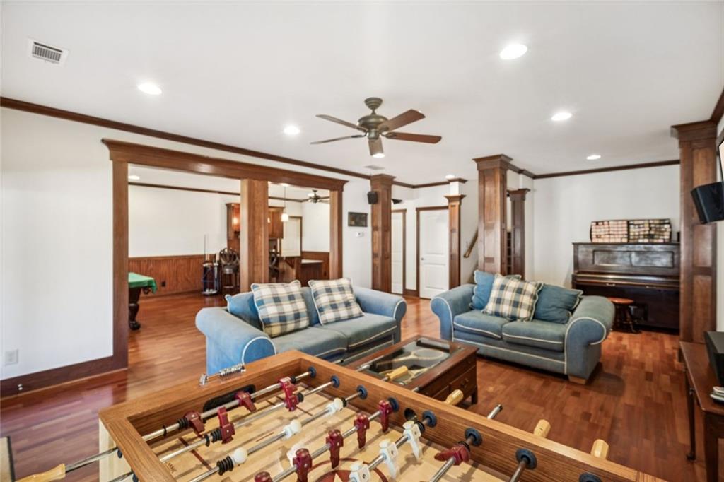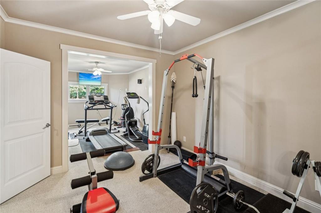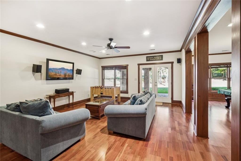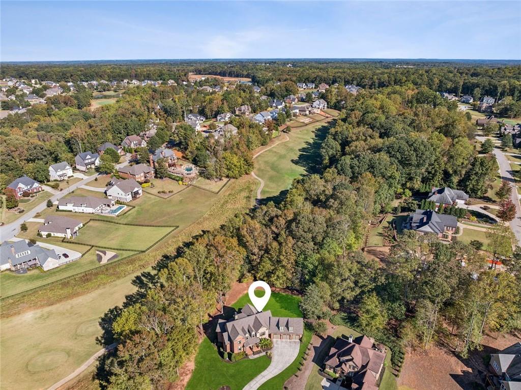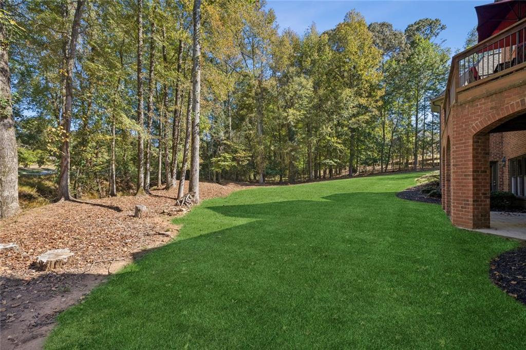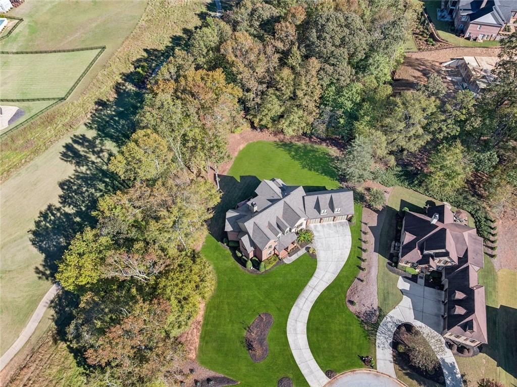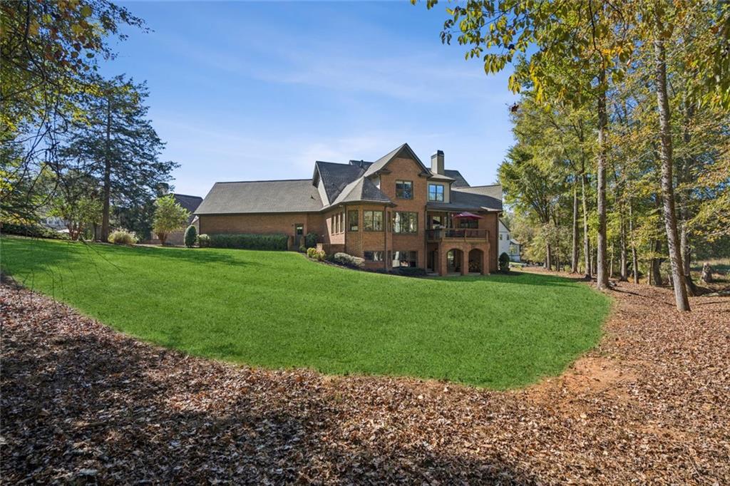 Elegant Four-Sided Brick Home on Golf Course Cul-de-Sac with Finished Terrace Level Perfectly positioned on a quiet cul-de-sac overlooking the 16th tee box, this beautiful four-sided brick home offers a thoughtful layout, timeless finishes, and a fully finished terrace level designed for comfortable living and entertaining. A covered brick front porch with double-door entry welcomes you into a grand two-story foyer with hardwood floors that flow throughout the main level and staircase. The spacious great room features built-in bookshelves with cabinets, a stacked stone fireplace with gas starter, coffered ceiling, and recessed lighting—an inviting space to relax or gather with friends and family. The private office with double doors, rich wood paneling, and crown molding provides a quiet retreat for work or study. The gourmet kitchen impresses with granite countertops, a five-burner gas cooktop with pot filler, slate backsplash, wine rack, and double undermount sink. Premium appliances include a Jenn-Air dishwasher and KitchenAid oven with a separate warmer oven and microwave. A large walk-in pantry with built-in shelving keeps everything organized and within easy reach. The adjoining breakfast room opens to the deck and a sun room that features tile flooring, gas log fireplace, ceiling fan, and scenic golf course views—perfect for enjoying morning coffee or evening sunsets. Just off the kitchen, the mudroom offers built-in cabinets and a coat closet, while a nearby half bath features crown molding and a decorative sink. The large laundry room includes cabinet storage, a sink, a folding counter, and a convenient laundry chute from the upper level. The main-level owner’s suite is spacious and serene, featuring chair rail molding, an octagon tray ceiling, recessed lighting, and ceiling fan. The spa-style ensuite bath includes a jetted tub, granite double vanity with knee seat, linen closet, tile flooring, separate water closet, and a shower with bench seat. The large walk-in closet features built-in organization and dual entrances. Upstairs, three well-appointed bedrooms each feature vaulted ceilings, ceiling fans, and their own private ensuite baths. A versatile step-up bonus room is ideal for a playroom, game room, or study space, while a hall linen closet provides added storage. The finished terrace level offers impressive living and entertaining options, featuring crown molding, heavy baseboard trim, and durable laminate flooring. The spacious family room opens through double doors to the backyard patio. The adjoining game room showcases beadboard paneling and a custom-built bar with an undermount sink, dishwasher, wine rack, and space for a refrigerator. A separate workout room offers direct backyard access, along with a convenient half bath and additional storage closet. A large guest suite with a walk-in closet and an ensuite bath with shower, complete with a shower seat. You will also find multiple storage areas—including a built-in tornado room—to complete the level. Outdoor living is easy to enjoy with a partially covered back deck featuring a ceiling fan and views of the golf course, plus a lower patio perfect for relaxing or entertaining. The professionally landscaped yard offers front and back sprinklers, lush zoysia in the back yard and bermuda in the front, and a large backyard with room to add a pool. The three-car garage includes two access doors, three bays with remote openers, and newly updated opener drives. Additional upgrades include a seven-year-old commercial 80-gallon water heater with continuous heat. This exceptional home combines quality craftsmanship, thoughtful design, and scenic golf course views in a peaceful cul-de-sac setting—offering a lifestyle of comfort, space, and timeless appeal.
