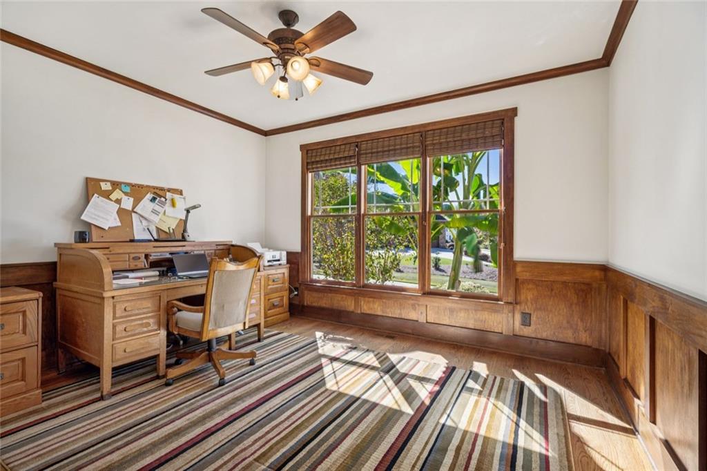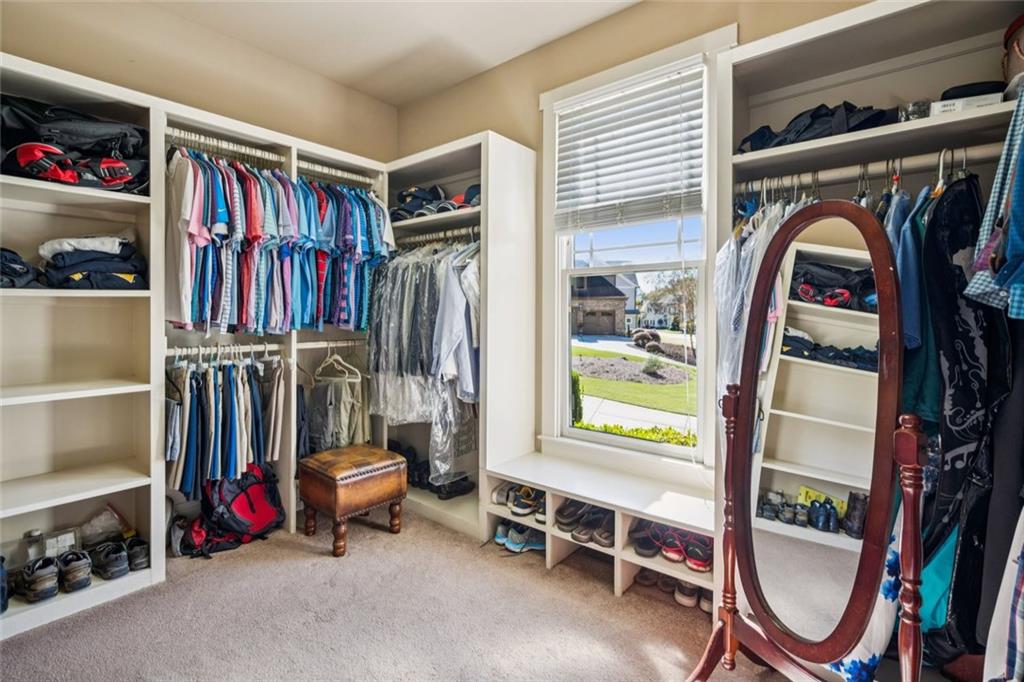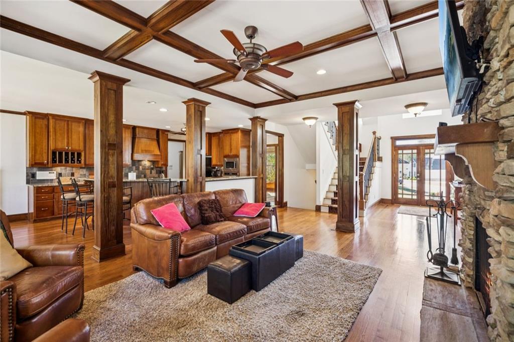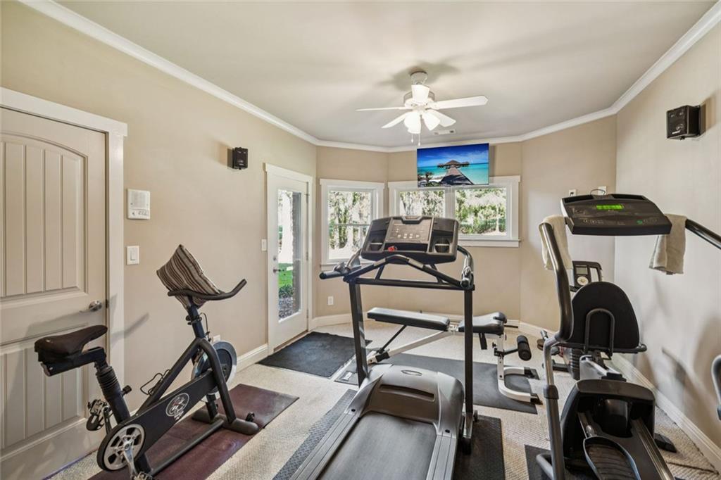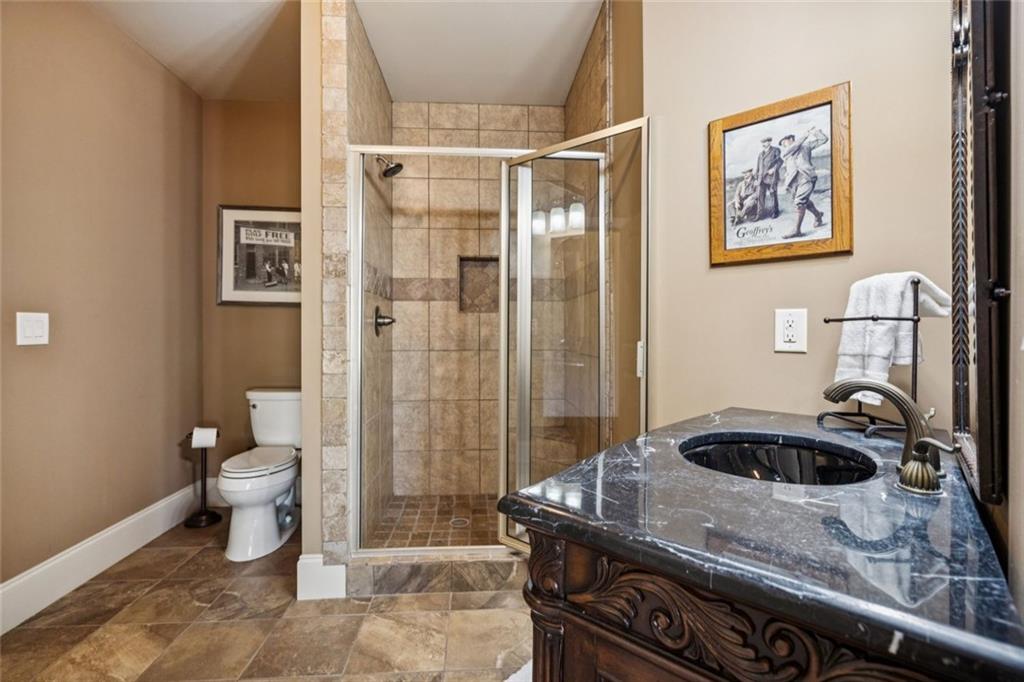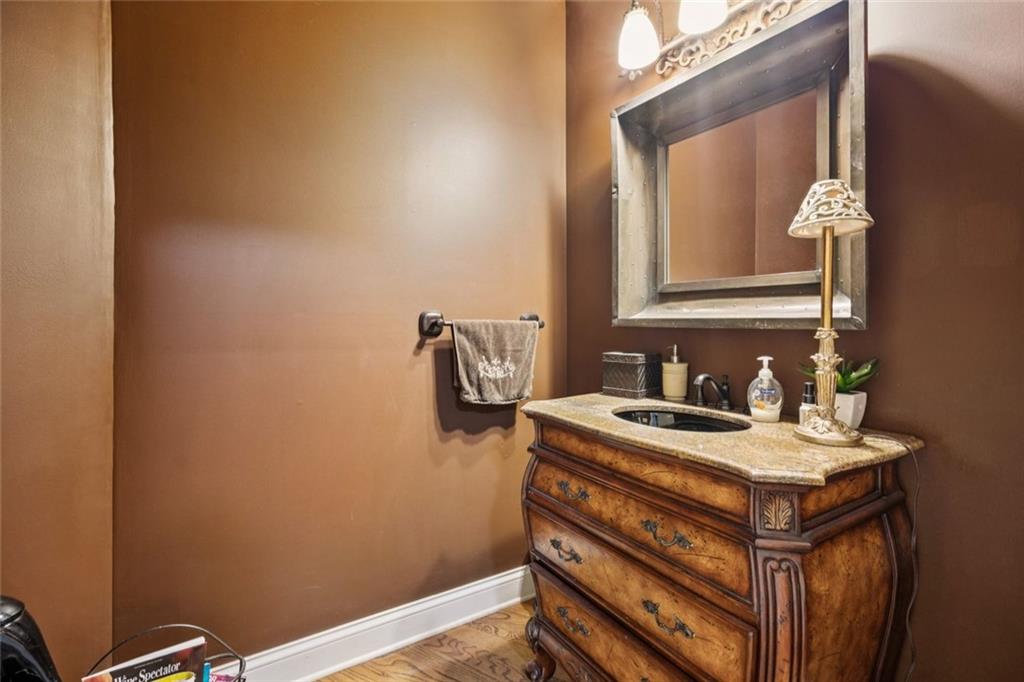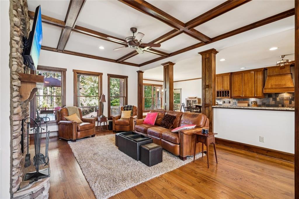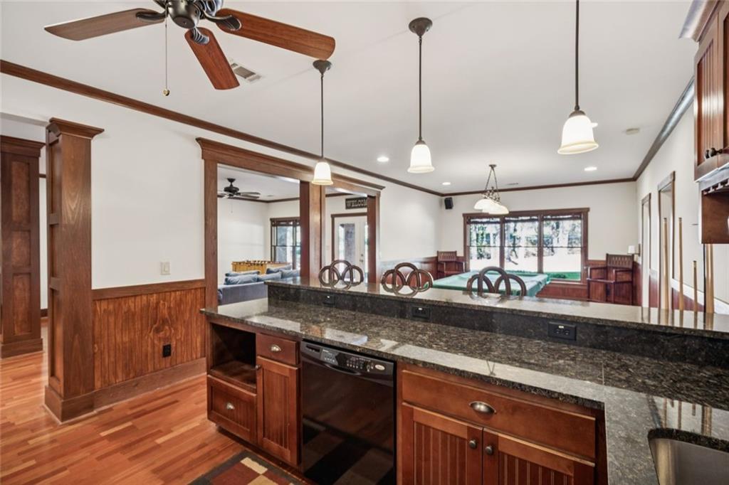Elegant Four-Sided Brick Home on Golf Course Cul-de-Sac with Finished Terrace Level Perfectly positioned on a quiet cul-de-sac overlooking the 16th tee box, this beautiful four-sided brick home offers a thoughtful layout, timeless finishes, and a fully finished terrace level designed for comfortable living and entertaining. A covered brick front porch with double-door entry welcomes you into a grand two-story foyer with hardwood floors that flow throughout the main level and staircase. The spacious great room features built-in bookshelves with cabinets, a stacked stone fireplace with gas starter, coffered ceiling, and recessed lighting—an inviting space to relax or gather with friends and family. The private office with double doors, rich wood paneling, and crown molding provides a quiet retreat for work or study. The gourmet kitchen impresses with granite countertops, a five-burner gas cooktop with pot filler, slate backsplash, wine rack, and double undermount sink. Premium appliances include a Jenn-Air dishwasher and KitchenAid oven with a separate warmer oven and microwave. A large walk-in pantry with built-in shelving keeps everything organized and within easy reach. The adjoining breakfast room opens to the deck and a sun room that features tile flooring, gas log fireplace, ceiling fan, and scenic golf course views—perfect for enjoying morning coffee or evening sunsets. Just off the kitchen, the mudroom offers built-in cabinets and a coat closet, while a nearby half bath features crown molding and a decorative sink. The large laundry room includes cabinet storage, a sink, a folding counter, and a convenient laundry chute from the upper level. The main-level owner’s suite is spacious and serene, featuring chair rail molding, an octagon tray ceiling, recessed lighting, and ceiling fan. The spa-style ensuite bath includes a jetted tub, granite double vanity with knee seat, linen closet, tile flooring, separate water closet, and a shower with bench seat. The large walk-in closet features built-in organization and dual entrances. Upstairs, three well-appointed bedrooms each feature vaulted ceilings, ceiling fans, and their own private ensuite baths. A versatile step-up bonus room is ideal for a playroom, game room, or study space, while a hall linen closet provides added storage. The finished terrace level offers impressive living and entertaining options, featuring crown molding, heavy baseboard trim, and durable laminate flooring. The spacious family room opens through double doors to the backyard patio. The adjoining game room showcases beadboard paneling and a custom-built bar with an undermount sink, dishwasher, wine rack, and space for a refrigerator. A separate workout room offers direct backyard access, along with a convenient half bath and additional storage closet. A large guest suite with a walk-in closet and an ensuite bath with shower, complete with a shower seat. You will also find multiple storage areas—including a built-in tornado room—to complete the level. Outdoor living is easy to enjoy with a partially covered back deck featuring a ceiling fan and views of the golf course, plus a lower patio perfect for relaxing or entertaining. The professionally landscaped yard offers front and back sprinklers, lush zoysia in the back yard and bermuda in the front, and a large backyard with room to add a pool. The three-car garage includes two access doors, three bays with remote openers, and newly updated opener drives. Additional upgrades include a seven-year-old commercial 80-gallon water heater with continuous heat. This exceptional home combines quality craftsmanship, thoughtful design, and scenic golf course views in a peaceful cul-de-sac setting—offering a lifestyle of comfort, space, and timeless appeal.