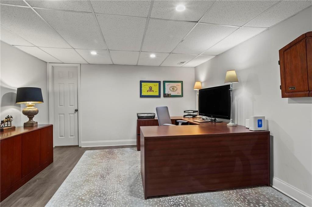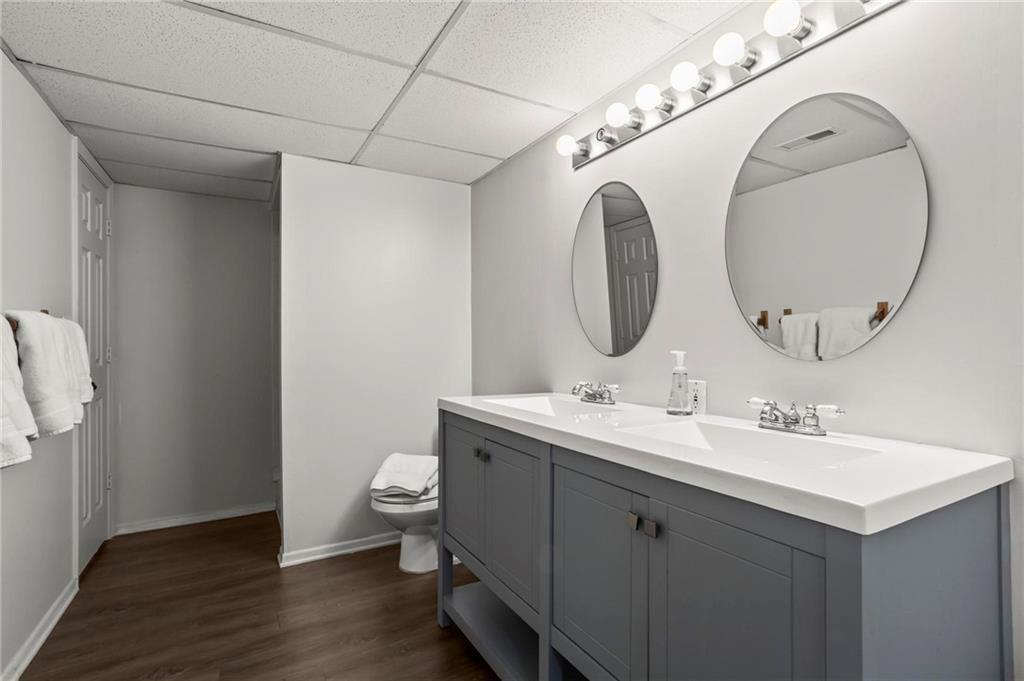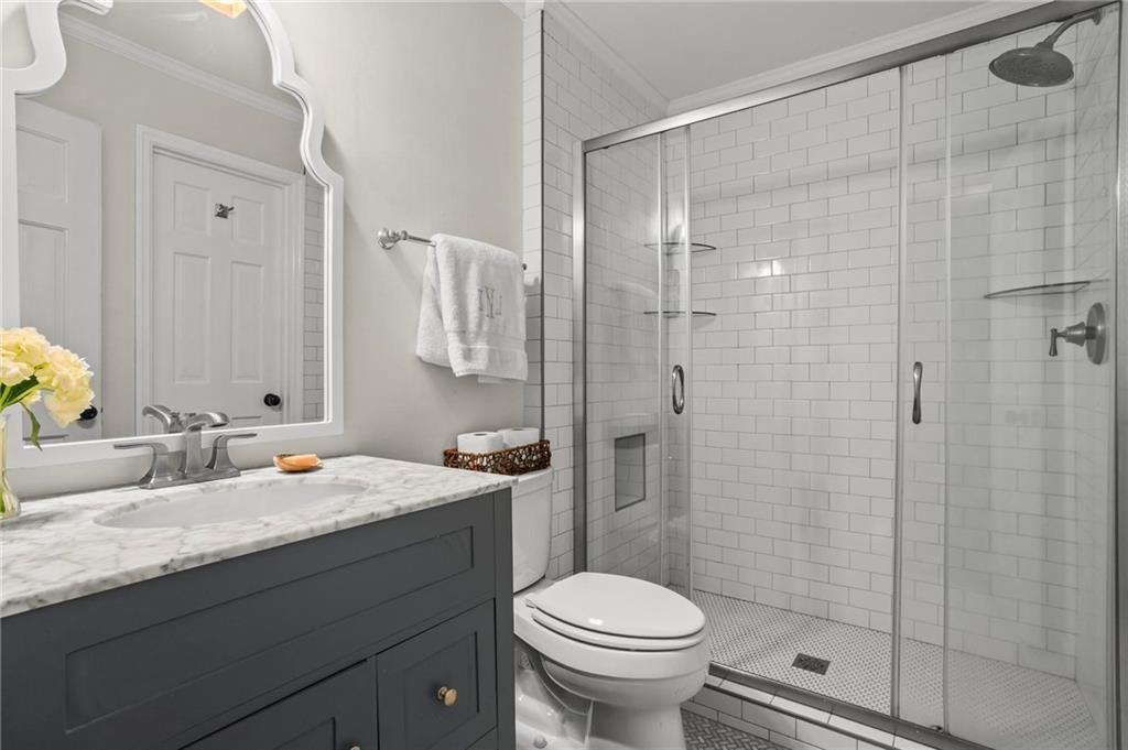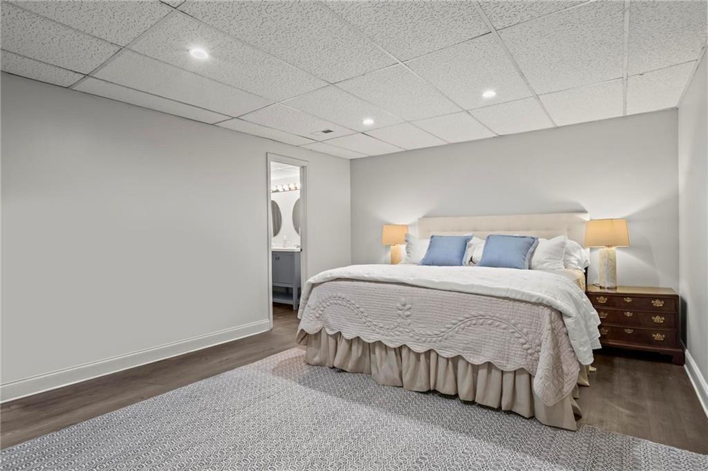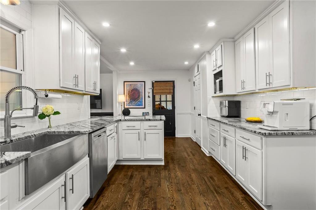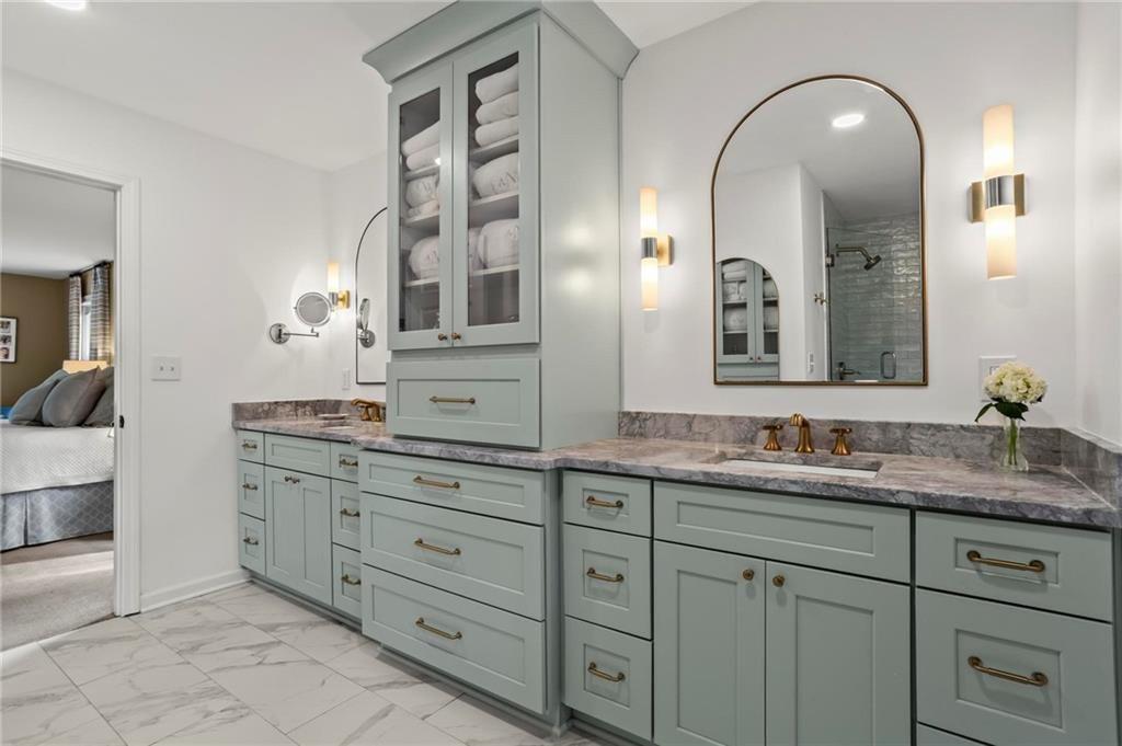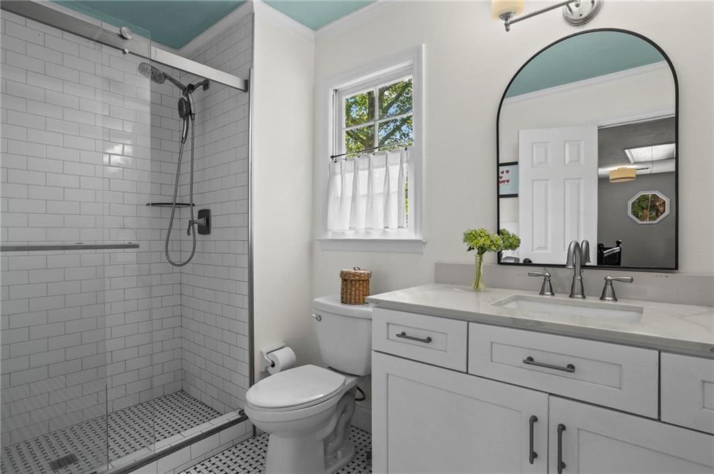 Beautifully renovated home in Walton HS offers exceptional curb appeal and a thoughtfully designed floor plan, nestled in an established neighborhood just 2 miles from Canton Street and the Chattahoochee River boardwalk. This well appointed residence combines classic charm, comfort, and great entertainment spaces. The pride and joy of this property is an expansive covered deck with a stacked stone fireplace as the focal point. Removable screens make pollen season a breeze. It is truly an outdoor living room used all year around. Inside, the sun-filled living room flows seamlessly into the dining area, which opens to the covered porch—creating a fantastic indoor-outdoor connection. A second set of double doors leads from the porch into a cozy keeping room/den, which continues onto an open-air patio, perfect for grilling and al fresco dining. In the center of it all, the workhorse of a kitchen has been renovated with white shaker cabinets, granite countertops supplying ample counter space and storage. Upstairs the oversized owner's suite is a peaceful retreat, featuring space for a sitting area, two walls of windows, and a luxurious newly renovated en-suite bath thoughtfully designed with custom cabinetry, quartzite countertops, and a classic timeless tile, this space offers an upscale experience at home. All secondary bedrooms are generously sized, filled with natural light, and freshly painted in neutral tones. Each secondary bathroom has also been renovated with fresh and modern finishes. The finished terrace level offers incredible flexibility with a spacious living area, a dedicated home office, guest bedroom, and full bath with a double vanity. A floor-to-ceiling movie screen and new LVP flooring make this space perfect for media, work, play or guests. Recent updates include new double hung windows, a newly poured driveway with parking pad, new garage doors, a professionally landscaped front yard, mahogany front door with beveled glass, and a level backyard perfect for play or pets. Enjoy swim/tennis amenities, low Cobb County taxes, award-winning schools, and quick access to GA-400. This home truly has it all—luxury, location, and lifestyle!