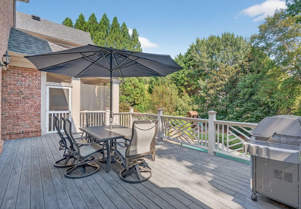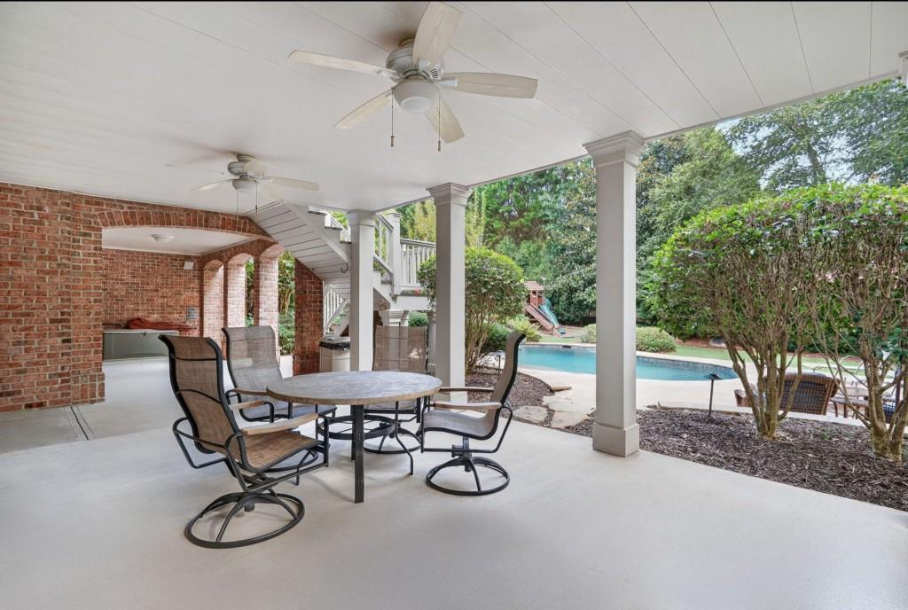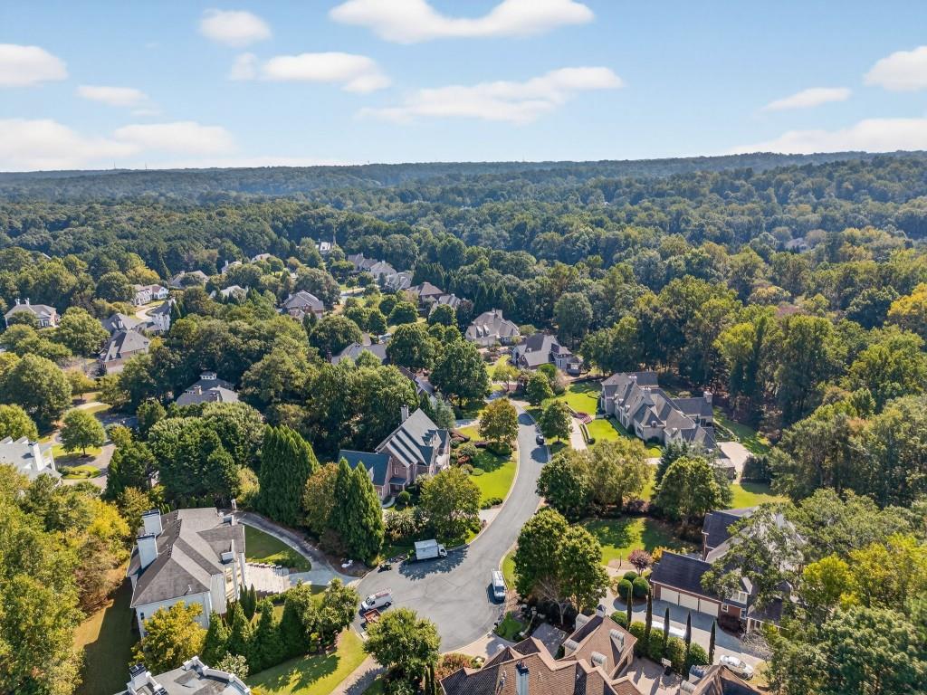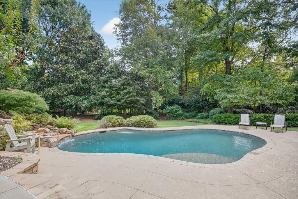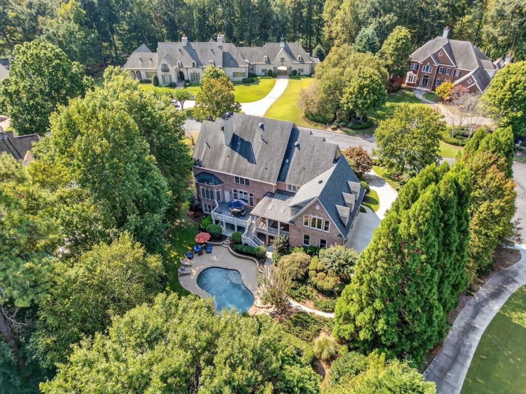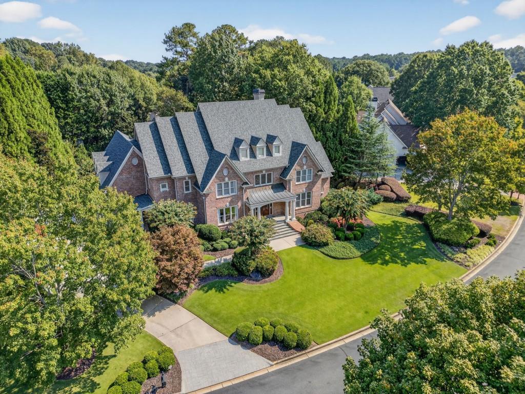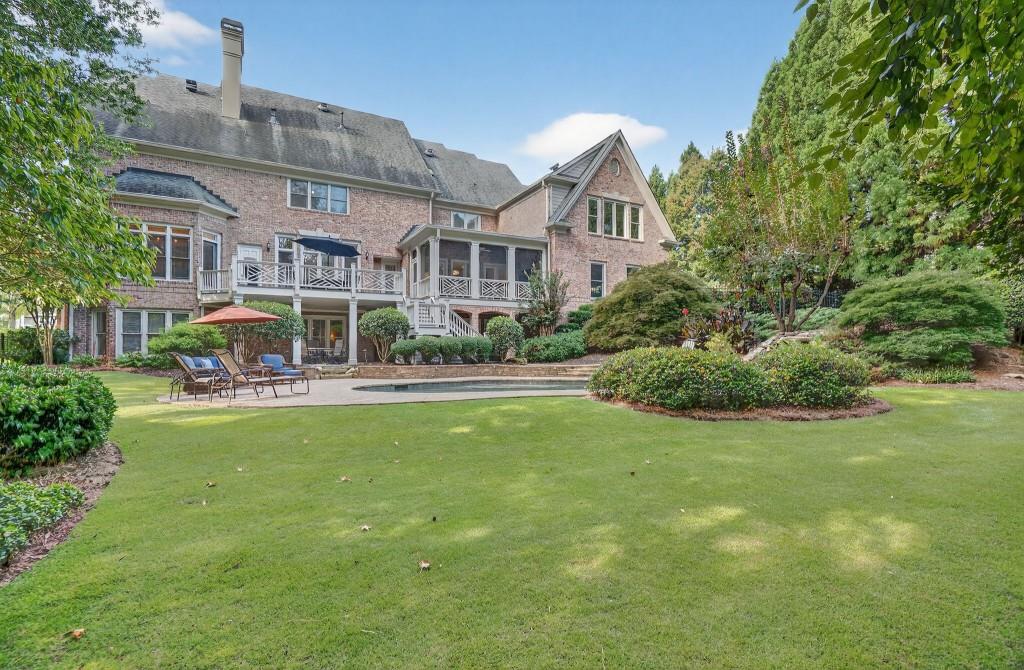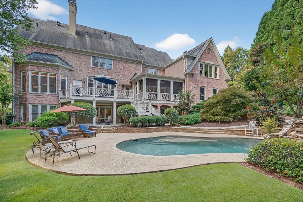 Experience resort-style living in this elegant estate on a private cul-de-sac in the highly sought-after community Winfield on the River, a one-of-a-kind gated neighborhood nestled on the serene banks of the Chattahoochee River. With its timeless brick architecture and natural landscaping, this home is a special retreat with luxurious amenities and exceptional indoor-outdoor living on +/- 0.70 acres. Step inside to a grand two-story foyer flanked by a formal dining room and a flexible office/library/den space-perfect for both elegant entertaining and everyday living. The expansive ceilings and wall of windows in the family room flood the space with natural light, while the open-concept layout flows seamlessly into the gourmet kitchen, complete with high-end appliances, abundant cabinetry, and an entertainer's island. Just off the kitchen, a spacious screened porch and deck overlook your private and spacious backyard oasis. Outside, your own backyard paradise awaits, featuring a stunning saltwater pool with a waterfall, framed by lush, manicured landscaping for maximum privacy and relaxation. The main level owner's suite is a peaceful retreat with a spa-like ensuite and serene views. Upstairs are three spacious bedrooms, three bathrooms, and a versatile bonus room-ideal for a playroom, teen suite, or additional living space. A large unfinished space with a private entry also has the potential to be an additional private suite for guests or multigenerational living. The daylight terrace level is a versatile space for everyday entertainment or hosting guests, offering a full pool bath, tiled playroom with closet, expansive rec room, gym, private office or 5th bedroom with full bath, fireside family room with wet bar, workshop, and extensive storage. Off the terrace level is an additional large covered patio space. Bordering a beautiful river across from a national park with recreation space and hiking trails, the neighborhood feels private and secluded, yet boasts proximity to premier shopping and dining at The Forum and top-rated public and private schools, including Johns Creek High School, Autrey Mill Middle School, Medlock Bridge Elementary School, Perimeter Christian School, and the Wesleyan School. The Atlanta Athletic Club is just minutes away. This home truly combines classic elegance with modern luxury in one of Johns Creek's most desirable gated communities.