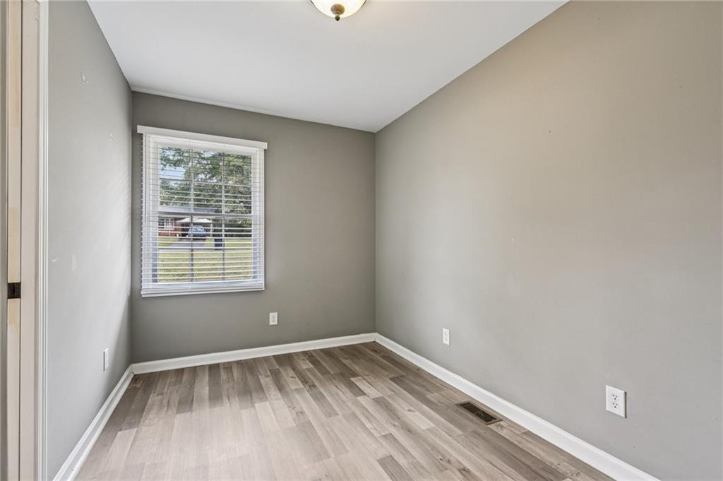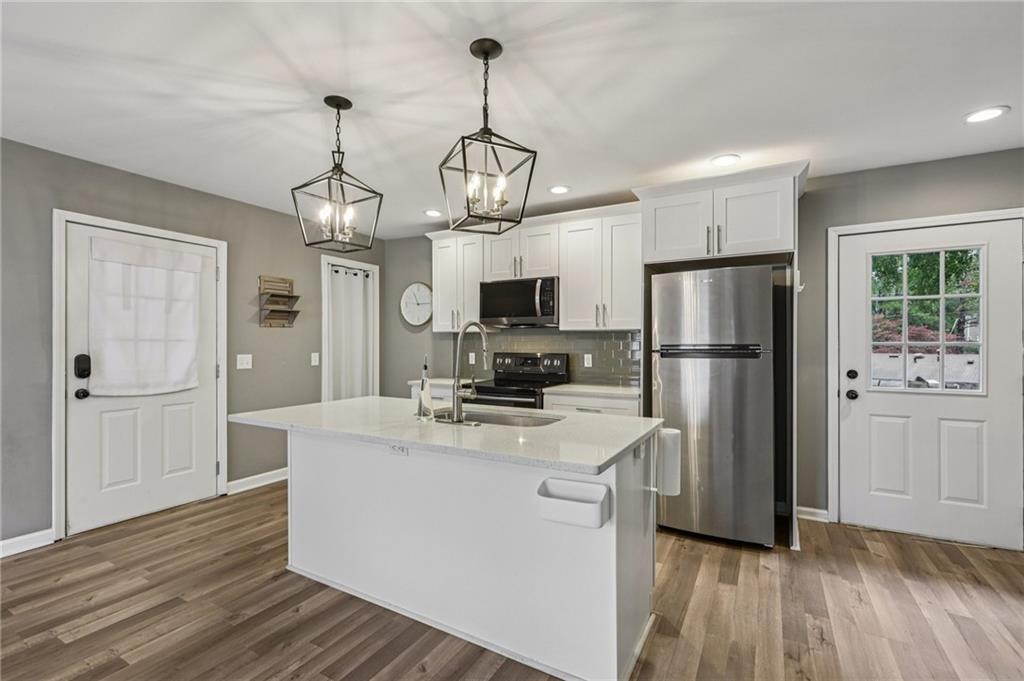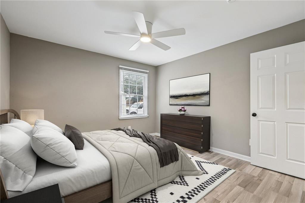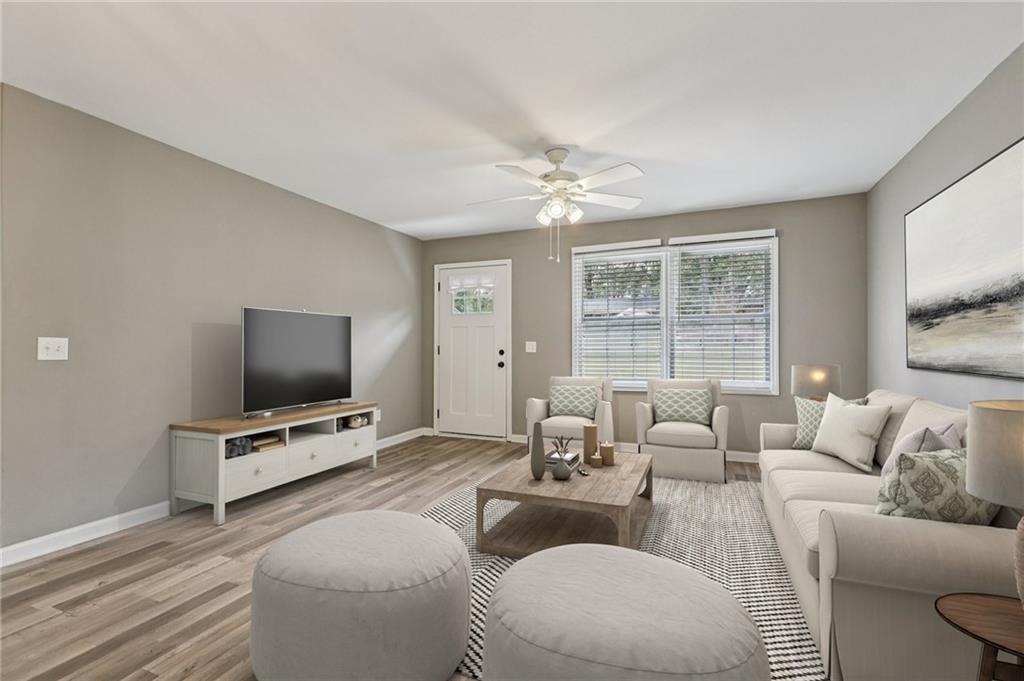 Updated Mid-Century Modern Comfort with Southern Charm! Beautifully updated with bright, open spaces and timeless touches, this home offers both style and practicality in a prime Marietta location. Step inside to discover gorgeous, easy-to-maintain laminate wood floors that flow through the sunlit living room. The on-trend kitchen impresses with stylish light fixtures, a spacious island with seating, stone countertops, and a classic tile backsplash—perfect for everyday living or entertaining. The spacious primary suite features an updated en-suite bath with a walk-in shower. Two secondary bedrooms and a full hall bath provide room for everyone! Outside, enjoy quiet mornings and peaceful evenings in a well-maintained yard fenced on three sides. Blue Jays and Cardinals flit among the trees as the sun rises over the backyard and sets behind the trees in front. The neighborhood has no HOA and offers true convenience—just 6 minutes to I-75, 8 minutes to Marietta Square, and 13 minutes to I-285. You’re close to top-rated schools (Sprayberry high school is a Georgia Blue Ribbon School of Excellence), Kennesaw Mountain, the Battery, and all that Atlanta has to offer. Don't miss your opportunity to book your tour today!