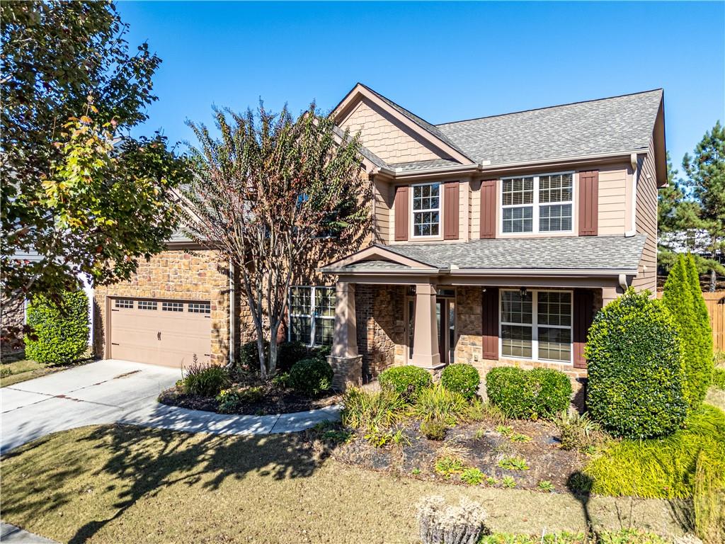 *******NEW PAINT FOR WHOLE HOUSE*********Welcome home to Meranova at Mill Creek, a swim/tennis community with tree-lined streets, sidewalks, great Gwinnett schools, excellent public parks just minutes away from groceries, shopping & restaurants, Mall of Georgia and Chateau Elan! Your new craftsman-style, stone and cement siding home with covered front and rear porches features five bedrooms and three baths with a bedroom/full bath, office and hard surface/low-maintenance flooring throughout the main level. Tons of natural light from the soaring, two-story foyer to the formal dining room with coffered ceilings, oversized family room and eat-in kitchen/breakfast area, the open concept plan is just perfect for entertaining large families and guests. On the second floor, you’ll enjoy a massive owner’s suite with dual trey ceilings, a sitting area, spacious bathroom, huge dual closets and a walkout, screened-in balcony overlooking the fenced back yard. Secondary bedrooms are roomy with a shared bathroom and laundry room in upstairs hallway. Unique, tandem depth garage works great for longer vehicles, extra storage, golf cart, workshop or additional storage for your toys. You’ll also appreciate the level, sodded rear yard that’s fenced for all your pets and kids or just a fantastic extension of outdoor living space!