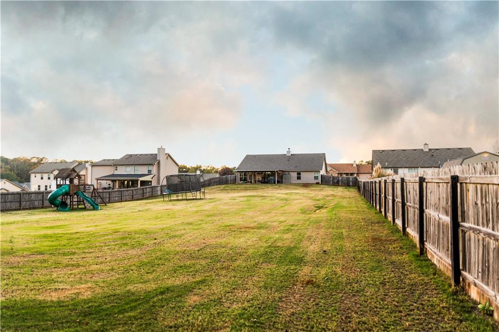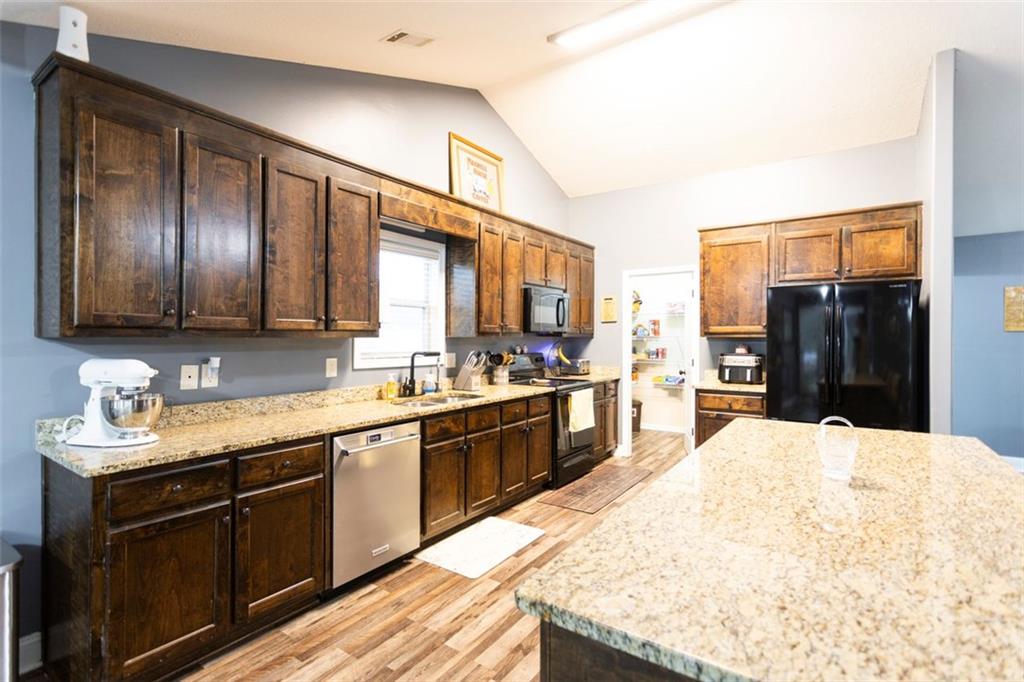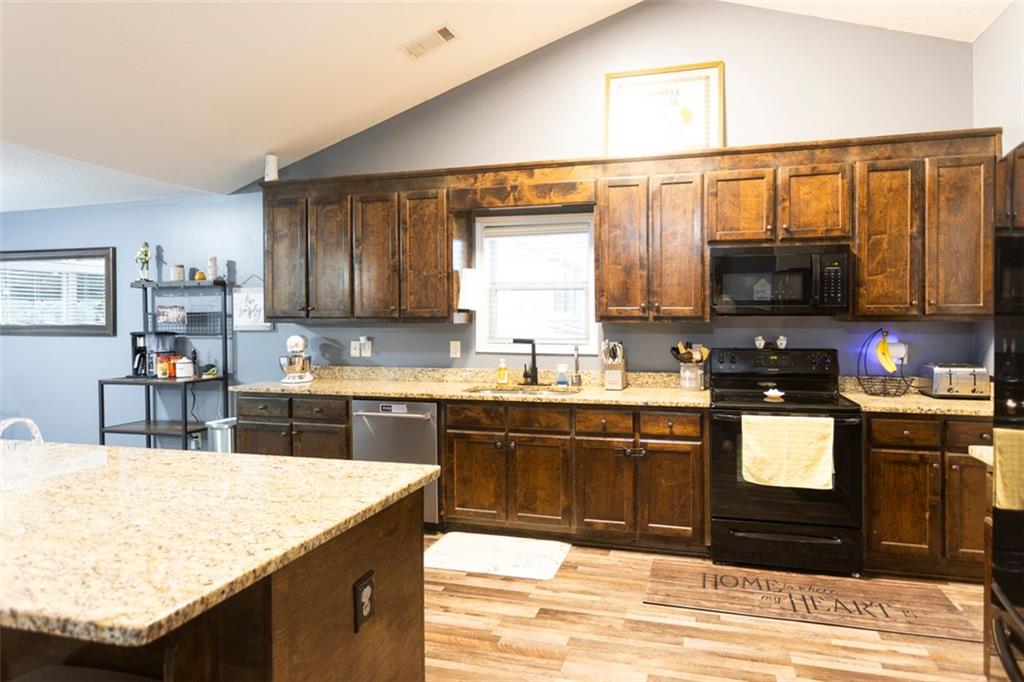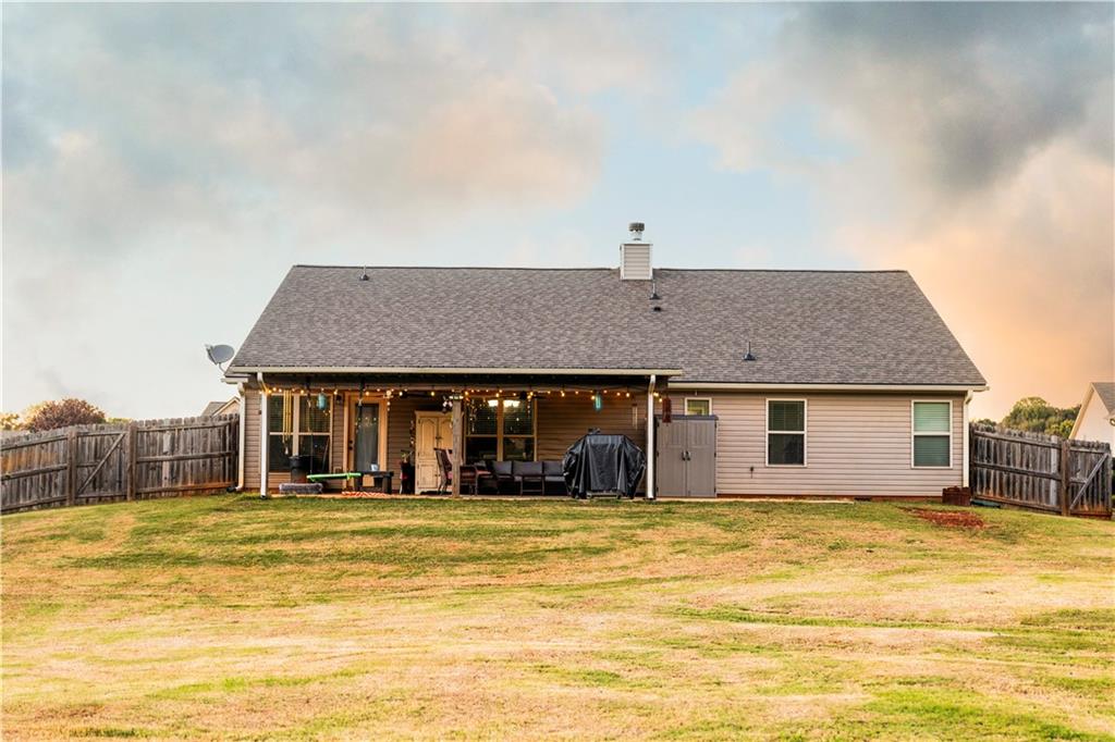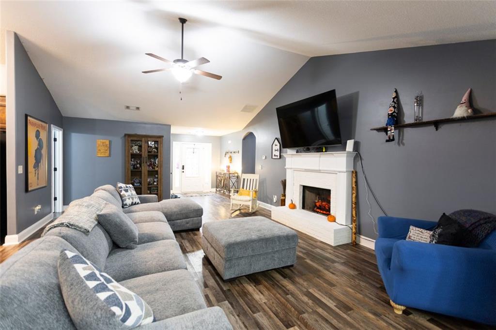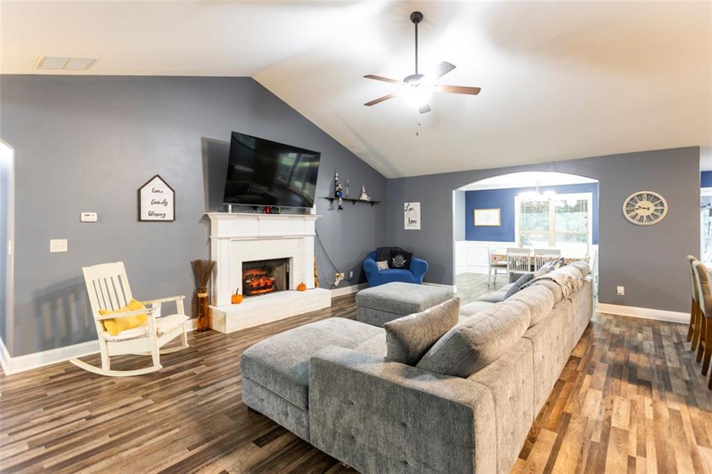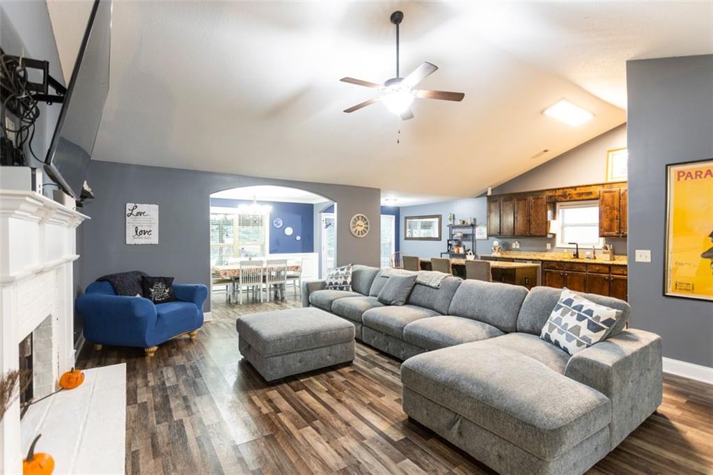 Discover your dream retreat in this stunning 4-bedroom, 2.5-bathroom ranch-style home nestled on a level lot in the peaceful Kensington Place neighborhood. Step into an inviting open-concept floor plan boasting vaulted ceilings in the main living area, a cozy wood-burning fireplace, and upgraded LVP flooring that flows seamlessly throughout. The kitchen shines with granite countertops, a spacious island, walk-in pantry, and adjacent breakfast nook, while a large dining room sets the stage for memorable gatherings. Retreat to the expansive primary suite featuring high ceilings, a large en-suite bath with double vanities, soaking tub, separate shower, and a massive walk-in closet. Three oversized guest bedrooms offer ample space for family or visitors, complemented by a convenient walk-in laundry room and shared full bathroom. Freshly updated with a new architectural roof, this great property extends outdoors to an expanded covered patio overlooking a generous fenced backyard— perfect for relaxation and entertaining. Don't miss this move-in-ready home ready for its new owner!