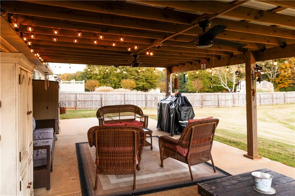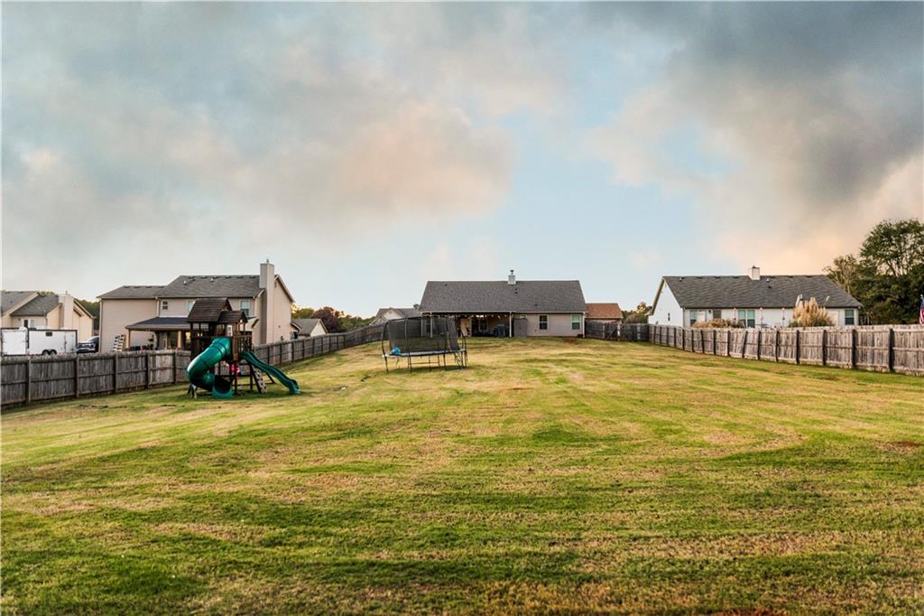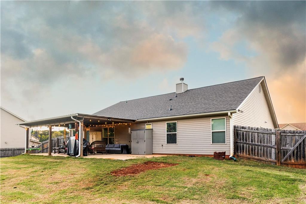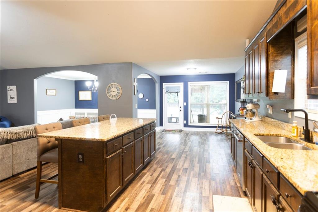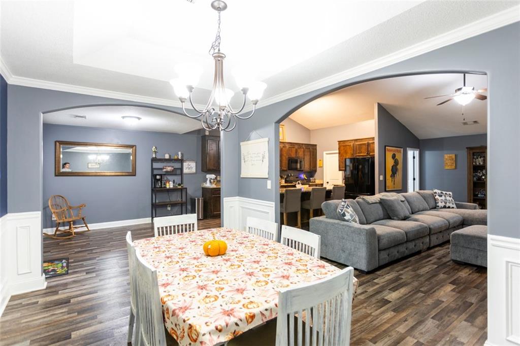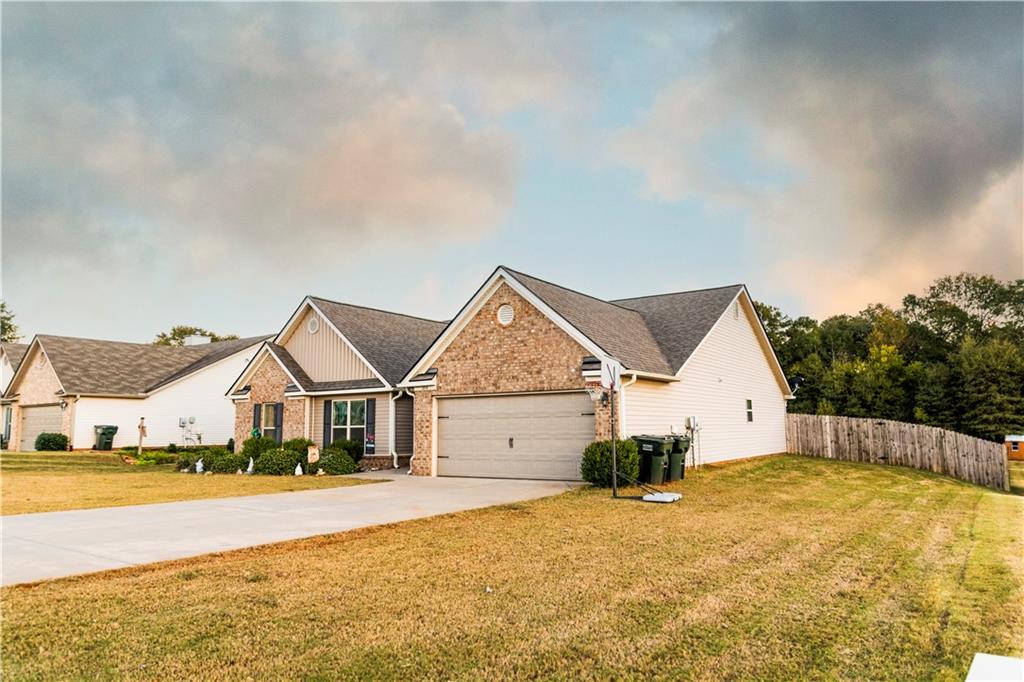 Discover your dream retreat in this stunning 4-bedroom, 2.5-bathroom ranch-style home nestled on a level lot in the peaceful Kensington Place neighborhood. Step into an inviting open-concept floor plan boasting vaulted ceilings in the main living area, a cozy wood-burning fireplace, and upgraded LVP flooring that flows seamlessly throughout. The kitchen shines with granite countertops, a spacious island, walk-in pantry, and adjacent breakfast nook, while a large dining room sets the stage for memorable gatherings. Retreat to the expansive primary suite featuring high ceilings, a large en-suite bath with double vanities, soaking tub, separate shower, and a massive walk-in closet. Three oversized guest bedrooms offer ample space for family or visitors, complemented by a convenient walk-in laundry room and shared full bathroom. Freshly updated with a new architectural roof, this great property extends outdoors to an expanded covered patio overlooking a generous fenced backyard— perfect for relaxation and entertaining. Don't miss this move-in-ready home ready for its new owner!