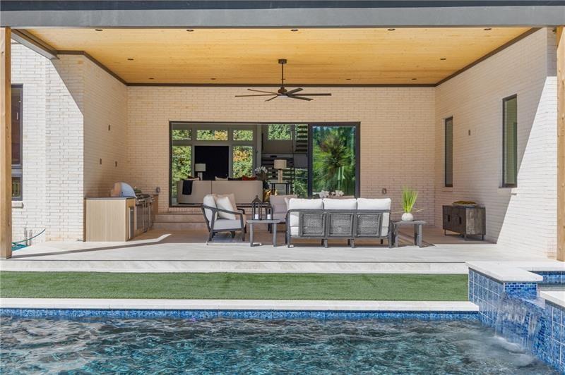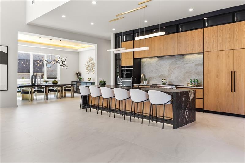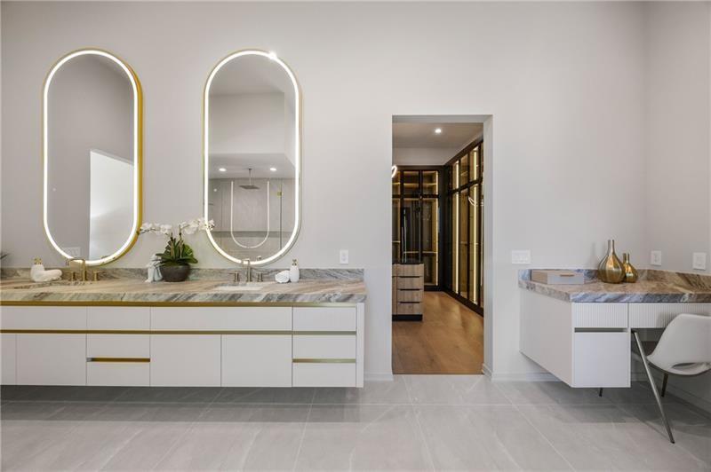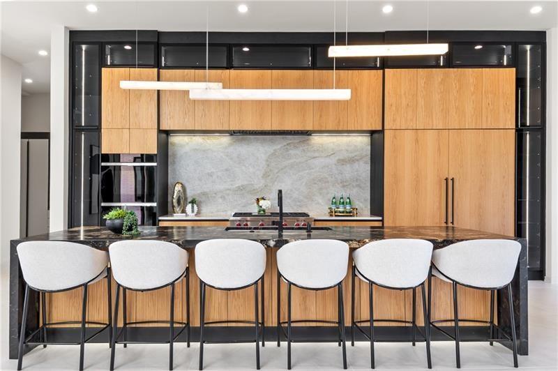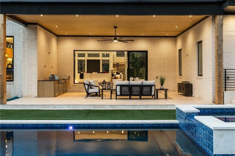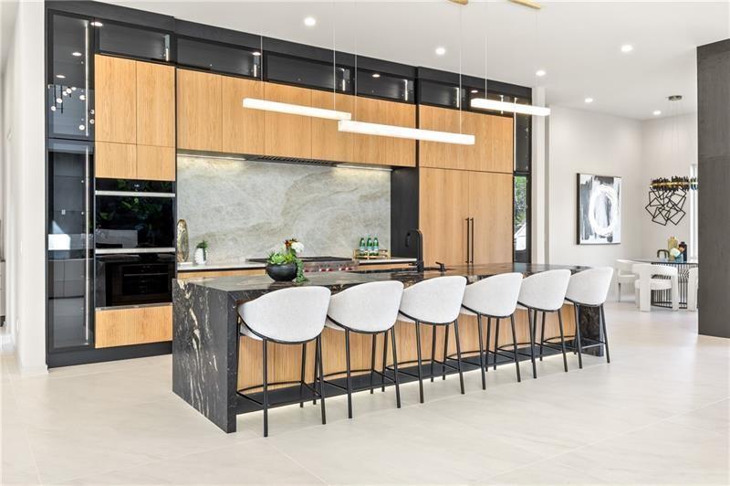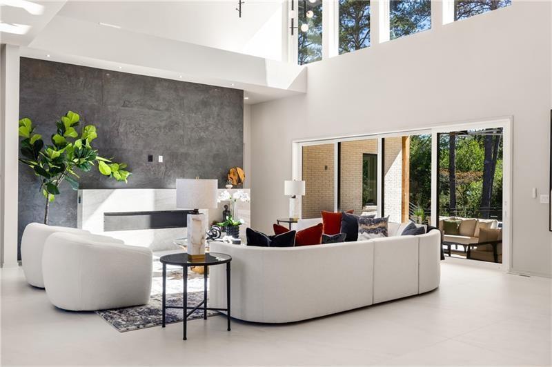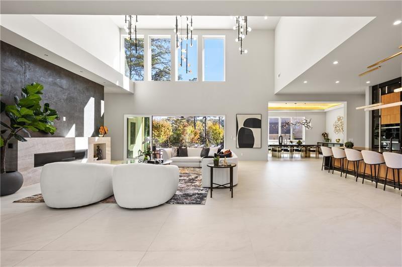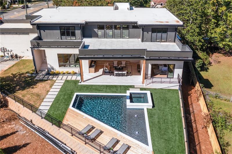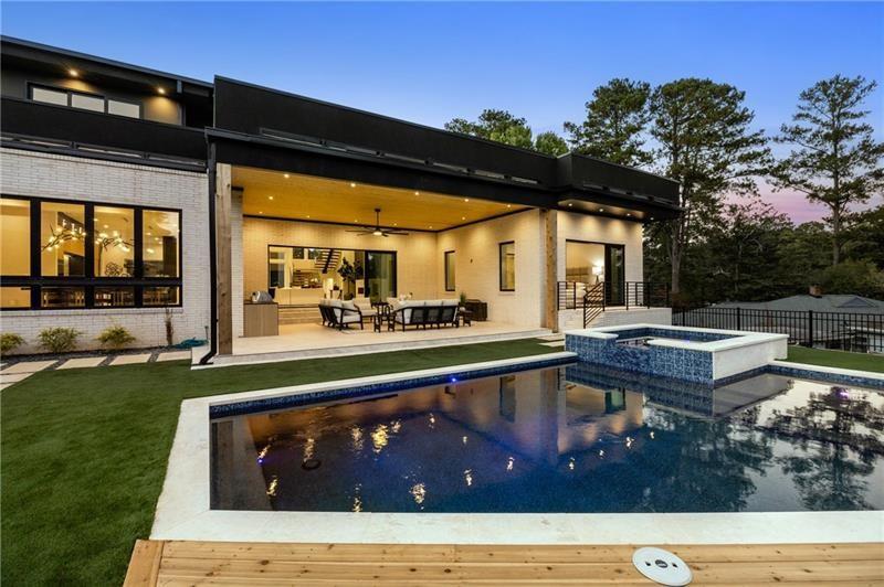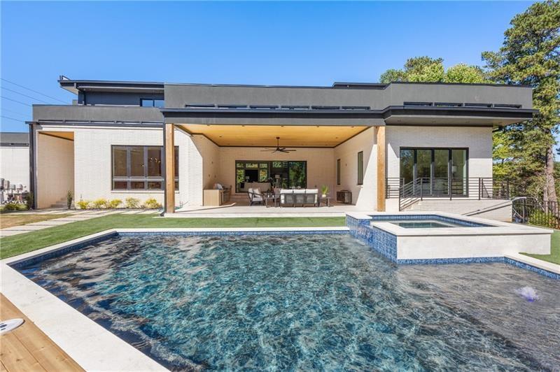 Welcome to this extraordinary modern estate, an architectural gem with a bold flat roofline, rooftop balconies, and an interior that radiates sophistication and style at every turn. Spanning multiple levels, this one-of-a-kind residence features a striking open floor plan, anchored by a two-story great room with floor-to-ceiling windows and a linear gas fireplace. The heart of the home is the chef’s kitchen that is nothing short of world-class: fully equipped with Sub-Zero and Wolf stainless steel appliances including double ovens, dishwasher, a dramatic 6-burner gas range, custom-crafted wood cabinetry with LED lighting, a full coffee station, and wine refrigeration. A modern floating staircase with glass railings ascends to the upper level, where you’ll find four expansive bedrooms, each with beautiful custom tile design en-suite baths and custom walk-in closets. The primary suite on the main floor offers a gorgeous bathroom with dual sinks, custom tile, soaking tub and walk-in custom closets with LED lighting that is the epitome of luxury in closet design, blending privacy with indulgence in a space designed to soothe and impress. An additional main-level bedroom or executive office adds versatility and convenience. The main level showcases 48x48 custom designer tile flooring, while wide-plank hardwoods bring warmth and elegance to the primary bedroom and upper level. A fully equipped second kitchen—complete with a gas range, refrigerator, sink, and dishwasher—offers added flexibility for entertaining or extended living. The walk-in pantry provides generous storage, and the mudroom, thoughtfully positioned just off the 4-car garage, adds seamless functionality. For ultimate convenience, the home includes two laundry rooms, one on each level. The partially finished basement expands the living space with an additional bedroom, full bathroom, and home gym. Five separate HVAC units ensure optimal comfort and energy-efficient climate control throughout this exceptional residence. Outside, the experience continues with a resort-style pool and spa, an expansive covered outdoor living area with a gas top of the line grill area equipped with stove, and beverage fridge and integrated lighting designed to complement the home’s clean architectural lines. Ideally situated in the heart of prestigious Sandy Springs, this exceptional residence offers effortless access to City Springs, top-tier schools, and premier dining—seamlessly blending luxury living with an unrivaled location.