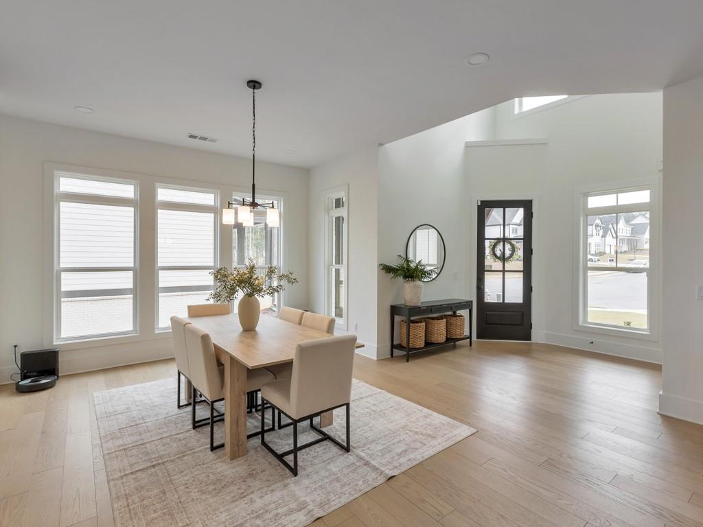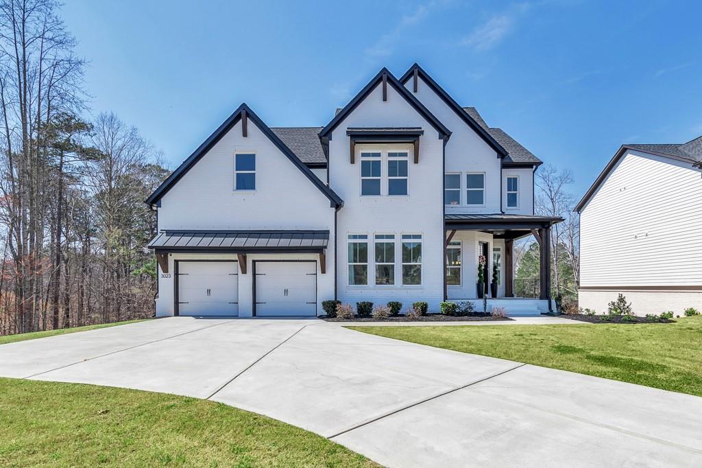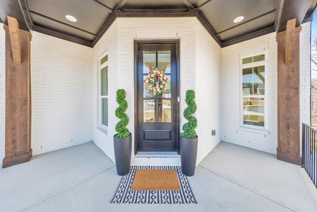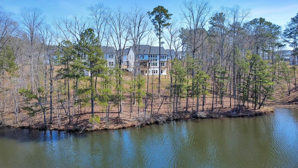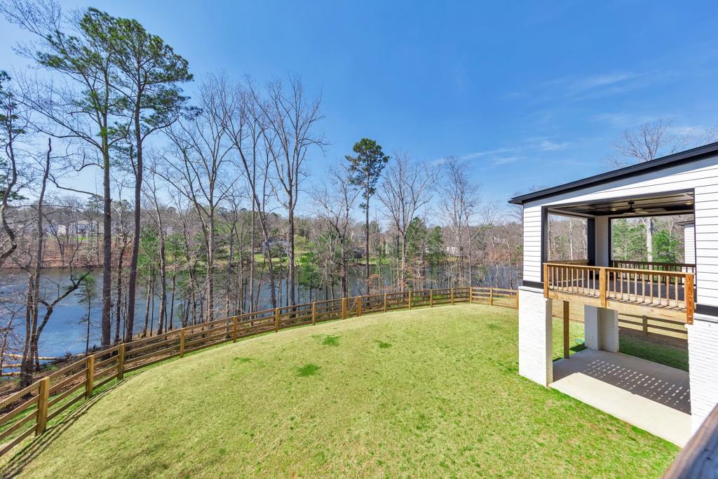 Welcome home to this exquisite 5 bedroom, 4 bathroom home built in 2024 in the highly sought-after Holly Farm community, perfectly situated on a private cul-de-sac lot with stunning lake views. This beautifully maintained home showcases exceptional craftsmanship, designer details, and a bright, airy floorplan filled with natural light, complemented by hardwood flooring throughout and a wired whole-home audio system for sound throughout. A charming covered front porch welcomes you into a grand two-story foyer, setting the tone for the elegance found throughout the home. Just off the entry, a private office with French doors and custom built-in bookshelves provides the perfect work-from-home space, while the separate dining room flows into the heart of the home—the modern kitchen. Designed for both everyday living and entertaining, the kitchen features abundant cabinetry, stone countertops, a large center island with seating, stainless steel appliances, and a sunny breakfast area. Accordion doors open from the kitchen to the covered deck, creating a seamless indoor/outdoor flow ideal for entertaining. The impressive two-story fireside family room is a true showstopper, complete with built-in bookshelves and a dramatic wall of windows that frame picturesque lake views. A secondary bedroom and full bathroom on the main level offer flexibility for guests or multigenerational living. Upstairs, the oversized primary suite is a luxurious retreat featuring a sitting area, tray ceilings, and a spa-inspired ensuite bath with dual vanities, a soaking tub, a sleek glass double shower, and a spacious walk-in closet with custom cabinetry. Three additional generously sized bedrooms, each with walk-in closets, share two full bathrooms on this level. A conveniently located upper-level laundry room with a sink adds to the home’s thoughtful design. The full unfinished basement offers endless potential to expand and customize to fit your lifestyle, and already includes a partially finished workout area. Outdoor living is equally impressive, with two covered decks on the main level and a covered patio below—perfect for relaxing or entertaining while enjoying peaceful lake views. The fenced-in backyard is spacious and level, offering ample room for a future pool while still leaving plenty of green space to enjoy. Additional features include an attached two-car garage and access to Holly Farm’s exceptional amenities, including a community pool, pickleball courts, pool house, firepit area, and nature trail. Ideally located with easy access to Downtown Woodstock, Downtown Milton, Downtown Alpharetta, and a variety of shopping, dining, and entertainment options, this home truly offers the best of luxury, comfort, and convenience.