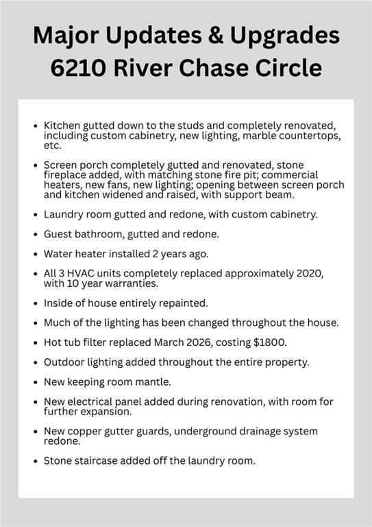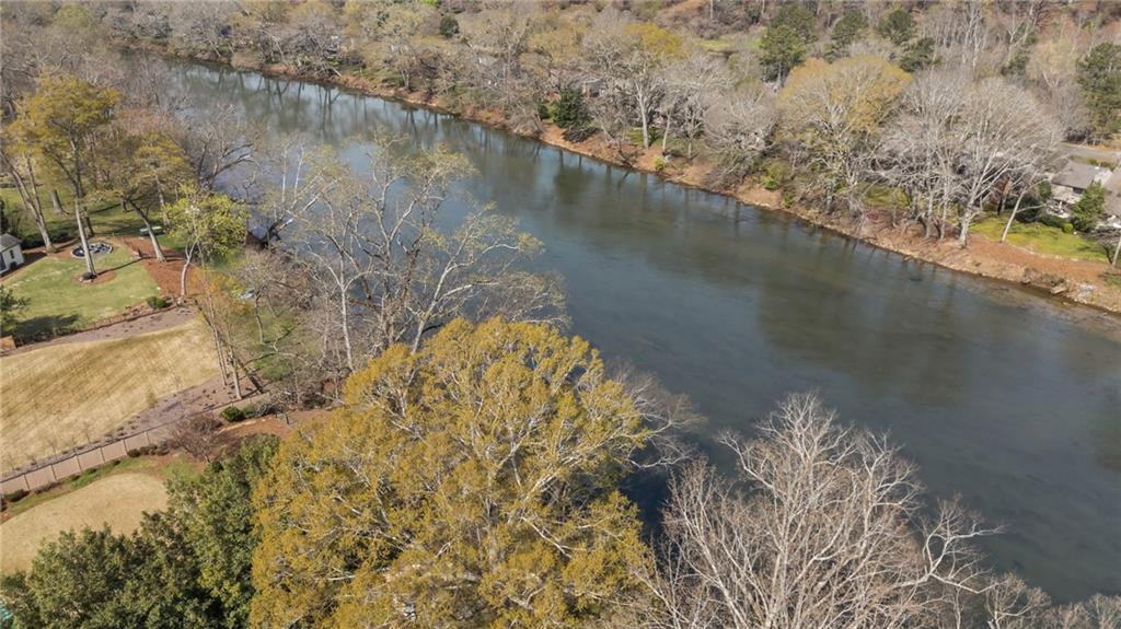 Set on a truly one-of-a-kind homesite with breathtaking views of the Chattahoochee River, this exceptional home offers a lifestyle that’s as peaceful as it is perfect for entertaining. Imagine evenings spent on your private riverside dock, where friends gather and the sound of the water sets the tone for unforgettable moments. The very best part, this home has the beauty of the River and has never flooded. Owners do not need to require flood insurance -truly the best of all worlds. Inside, the home has been designed with the utmost in attention to detail. The professionally designed, chef-inspired kitchen is the heart of the home, featuring abundant cabinetry and counter space, a large island with breakfast bar seating, a beautiful breakfast nook, and upgraded stainless steel appliances. The thoughtful design offers both beauty and functionality flowing seamlessly into the inviting keeping room, complete with a double-sided fireplace and breathtaking views of the backyard and river —ideal for relaxed everyday living. The new addition of the screened in porch is fabulous for year round entertaining, with a wood burning fireplace and commercial grade heaters. The oversized primary suite on the main level is a true retreat, offering its own fireplace, custom built-ins, and serene river views. The spacious primary bath includes dual vanities and generous his-and-hers closets for ultimate comfort and convenience. Upstairs and beyond, you’ll find thoughtfully designed secondary spaces that truly impress, including a bonus room, two dedicated office areas, and a highly desirable second primary suite. The versatile bonus room with built-ins provides the perfect space for a teen hang out, work out room, home office or more. Additional highlights include a functional mudroom with durable flooring and extensive built-in storage, along with a bright, airy interior enhanced by floor-to-ceiling windows that bring the outdoors in. The possibilities are endless with an oversized, vaulted, unfinished bonus room on the second level that has already been plumbed. Step outside and you’ll quickly see why this property is so special. A charming stone pathway leads to riverbank seating, while a spacious patio just off the home offers plenty of room for outdoor dining and gatherings and your very own built in spa. The level lot, circular driveway, and beautifully designed outdoor spaces complete the package. Located in the sought-after River Chase community—known for its active swim and tennis amenities and top-rated schools—this is a rare opportunity to own a true riverfront retreat. If you’ve been dreaming of life on the water, this is the one.